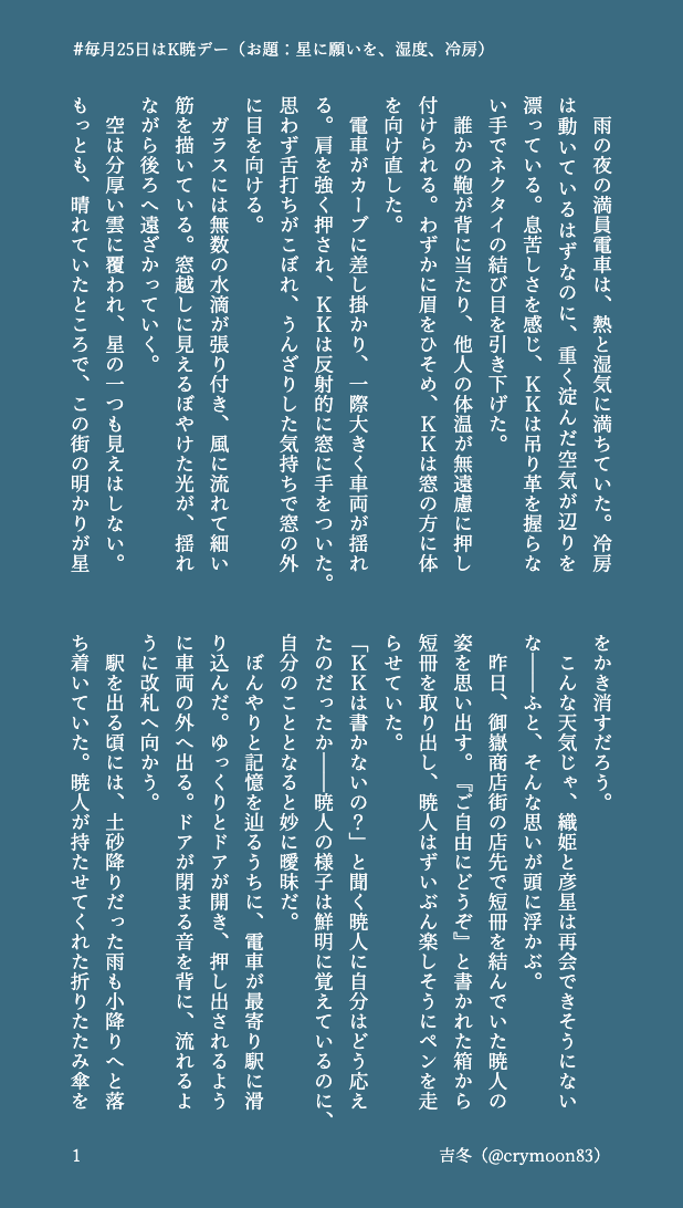 吉冬⛩☆quiet followDONE #毎月25日はK暁デーお題:星に願いを、湿度、冷房田舎住みゆえ、通勤ラッシュの恐ろしさは想像もつきません。 #K暁 #毎月25日はK暁デー show all(+1 images) Tap to full screen (size:618x1092).Repost is prohibited Let's send reactions! freqpopularsnackothersPayment processing Replies from the creator Follow creator you care about!☆quiet follow 吉冬⛩DONE #毎月25日はK暁デーお題:台風、○○の秋、長袖何でも口実にするけけおじと、結局絆されるあきとくんです。 2 吉冬⛩DONE #毎月25日はK暁デーお題:秋雨、ハッピーバースデー心配性のあきとくん(27)の誕生日の話です。 3 吉冬⛩DONE #毎月25日はK暁デーお題:休日、身支度、デートカレンダー企画に提出した話の、あおきとくん視点です。 3 吉冬⛩DONE #毎月25日はK暁デーお題:星に願いを、湿度、冷房田舎住みゆえ、通勤ラッシュの恐ろしさは想像もつきません。 2 吉冬⛩DONE #毎月25日はK暁デーお題:夏支度、雨模様、ビール何だかんだ言いつつけけおじに甘いあきとくんと、そんなあきとくんが可愛くてしゃーないけけおじが好物です。 2 吉冬⛩DONE #毎月25日はK暁デーお題:洗濯日和、端午の節句、連休三歩進んで二歩下がるけけおじと、それを見守るあきとくんの話です。 3 related works 吉冬⛩DONE #毎月25日はK暁デーお題:ジューンブライド、ボーナス、願い事うちのけあきは過去を繰り返さないよう、お互いが自分の気持ちを伝える努力をちゃんとしてますよ、という話。 3 subaccount3210DONE #毎月25日はK暁デー【ジューンブライド】【ボーナス】【願い事】※純度100%けあきです!!!※ナチュラルに全員生きています 2125 085TRAINING #毎月25日はK暁デー より『ジューンブライド』 6 吉冬⛩DONE #毎月25日はK暁デーお題:彼岸花、徒競走けけおじの色んな面が好きなあきとくんの話。名有りのモブ依頼人が登場します。 7 柑橘🍊DONE9月のK暁デーでお題は「彼岸花」で書かせていただきました!個人的に彼岸花は好きです! 1646 subaccount3210DONE #毎月25日はK暁デー【秋雨】【ハッピーバースデー】【花火】2025年8月急に閃いて書いたので上手く書けていないかもしれないので雰囲気だけ読んでいただけたら幸いです。 1831 ことざきDONE24年5月の、#毎月25日はK暁デー に参加させていただきました。お題は『傘』『真夏日』『ネクタイ』。プレゼントしあうK暁です。 6413 pasono_riDONEK暁 #毎月25日はK暁デー 「願い事」「ジューンブライド」で失礼致します 2 臓物(GwT)DONE #毎月25日はK暁デー9月のお題「彼岸花」で参加させていただきました!(※Twitterに上げていたものと同じ内容です) 6 recommended works ねこまんまMOURNINGKKと暁人が連休を振り返るだけの話。→の続きhttps://poipiku.com/1385435/6645649.html 1421 みらいDONE世界観はいつも通りおじぬいを題材に書きたかったので、ぬいに萌える暁人君です。一応K暁です。続き→https://poipiku.com/5178582/6810440.html 1521 _hinon_TRAININGK暁漫画モドキ※R-18pw/🏍️のナンバー _hinon_TRAININGR-18 K暁 騎乗位どうしても鼻水を描いてしまう_(┐「ε:)_pw/🏍️のナンバー 32honeymoonDONE7月度ワンライ◆お題:浴衣と花火今回も参加させていただきました!でも結局2時間かかってしまったので本来の意図からは失敗です・・・ゴメンナシャイお決まりの二心同体軸ED後世界です。なんとかえろは阻止しましたがこの後のえろは書こうと思えば書けます!続き書けー!の方はリクエストください・・・・笑 5019 アカリDOODLE狐aktくんとKおじのその後の話。未遂な上コメディです。 4836 リキュールTRAINING1日1K暁の140文字SSまとめ10日分③本編軸、IF、日常系、雰囲気ほんのりえっちなどいろいろなK暁。140文字SSのお題お借りしています。 1719 085DONE【とある廃村のはなし】もとはリクエスト頂いて書いたものなので、丸々一話読めます。短編集の雰囲気をお楽しみいただければ幸いです。(※本書は間違い探し程度に加筆修正されております) 8809 リキュールDONE #毎月25日はK暁デー お題【スーツ】参加させていただきました!牛丼作って食べるK暁です。相変わらずKK生存IF。 8