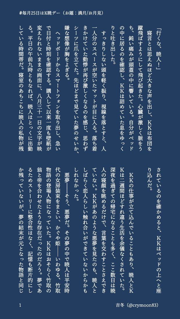 吉冬⛩☆quiet followDONE #毎月25日はK暁デーお題:満月、お月見情けないけけおじばっかり書いてる気がしますが、性癖なので許してください。 #K暁 #毎月25日はK暁デー show all(+3 images) Tap to full screen (size:618x1092).Repost is prohibited Let's send reactions! freqpopularsnackothersPayment processing Replies from the creator Follow creator you care about!☆quiet follow 吉冬⛩DONE #毎月25日はK暁デーお題:台風、○○の秋、長袖何でも口実にするけけおじと、結局絆されるあきとくんです。 2 吉冬⛩DONE #毎月25日はK暁デーお題:秋雨、ハッピーバースデー心配性のあきとくん(27)の誕生日の話です。 3 吉冬⛩DONE #毎月25日はK暁デーお題:休日、身支度、デートカレンダー企画に提出した話の、あおきとくん視点です。 3 吉冬⛩DONE #毎月25日はK暁デーお題:星に願いを、湿度、冷房田舎住みゆえ、通勤ラッシュの恐ろしさは想像もつきません。 2 吉冬⛩DONE #毎月25日はK暁デーお題:夏支度、雨模様、ビール何だかんだ言いつつけけおじに甘いあきとくんと、そんなあきとくんが可愛くてしゃーないけけおじが好物です。 2 吉冬⛩DONE #毎月25日はK暁デーお題:洗濯日和、端午の節句、連休三歩進んで二歩下がるけけおじと、それを見守るあきとくんの話です。 3 related works ウジムシ蛾DONEちょっと書いたのでのせてみます。K暁。 3704 32honeymoonMOURNING・マンネリ防止のために少しだけ変わり種。K暁。痩男が名前だけ登場します・二心同体軸ですがご都合主義でKKが体を得てます・ゲーム内時間で言うと5章の終わりくらいの時間軸・暁→K、K→暁の両片想い、とみせかけた完全両想い・最初やや無理強い表現はありますが基本的には愛し合ってます!最後中出し表現あります苦手な方はご無理なさらずそっ閉じで。PASS→20歳以上ですか?英語3文字でどうぞ。 7478 アカリMEMOアップしたK暁(🦊)の小ネタと🦊暁くんの絵です。 2 085TRAINING #毎月25日はK暁デー より『ジューンブライド』 6 鯖目ノスDONEゴスハンK暁小説エピローグ編です長々とお付き合いありがとうございました。これにて完結です。K暁といいつつもおじさんのクソデカ感情が露呈しただけですが将来的にK暁になる予定だからオッケー(?) 9522 _hinon_CAN’T MAKEKKおじさんの匂いに酔っぱらう猫暁人くんのお話(猫パロ)K暁 337 na2me84DOODLE140文字がたまったので纏めました。 21 吉冬⛩DONE #毎月25日はK暁デーお題:彼岸花、徒競走けけおじの色んな面が好きなあきとくんの話。名有りのモブ依頼人が登場します。 7 時人歩DONEこのCPで書くのは初めてなので初投稿です。こんな処女作で大丈夫か。まだゲーム完走してないんですけど、これはここ逃がすと一年後になってしまうのでフライングで失礼します……!K暁です・3・ 2124 recommended works カズルMOURNING頑張らなきゃナチュラルにたらす男、それが黒崎蘭丸。 2 おにくお そうめんTRAINING斎山SS カルデア時空 HENTAI 単衣を単って誤字がある 肘を膝って誤字がある 6 ねこまんまMOURNING #0514K暁ワンライ +間に合わなかったとき用に描いておいた落書き 4 みらいDONE腐女子の麻里ちゃんと絵梨佳ちゃんがK←暁で萌える話。腐女子表現苦手な人は回れ右。苦情は受け付けておりません!ちゃんと、K暁です。続き→https://poipiku.com/5178582/6937443.html 1964 _hinon_TRAININGR-18 K暁うーんバランスがなぁ・・・pw/🏍️のナンバー _hinon_TRAININGR-18 K暁 騎乗位どうしても鼻水を描いてしまう_(┐「ε:)_pw/🏍️のナンバー 32honeymoonDONE◇#毎月25日はK暁デー ◇お題:匂い・久しぶりのあまいちゃ糖度120ぱーせんとなので苦手な方は要注意!・KKと暁人くんが同棲してる世界のおはなし・相変わらずKKが暁人くん大好きマン長編をあげた後だったので、今回は短くさらっと。豪雨つづくここ最近、太陽が恋しくなって書いた作品です。台風の余波で大変な思いをしている皆さまの地域に、はやく気持ちいい秋晴れが届きますように。 2373 リキュールDONE #毎月25日はK暁デーお題【微熱】に参加させていただきました!風邪っぴき暁人くんと粥のお話。 5 吉冬⛩DONE #毎月25日はK暁デーお題:夢うつつ、葉桜、アウター初参加失礼いたします。お題全部詰め込んだら、おじさんが終始ときめいてる話になりました。 4
