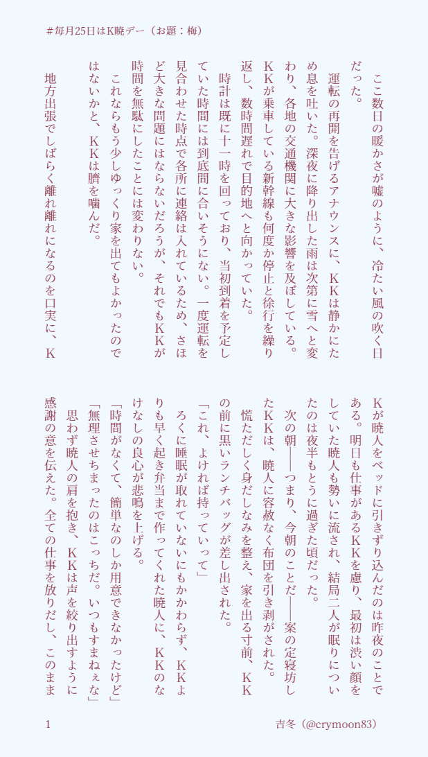 吉冬⛩☆quiet followDONE #毎月25日はK暁デーお題:梅あきとくん恋しさに、ワーカーホリックが治りかけるけけおじの話。 #K暁 #毎月25日はK暁デー show all(+2 images) Tap to full screen (size:618x1092).Repost is prohibited Let's send reactions! freqpopularsnackothersPayment processing Replies from the creator Follow creator you care about!☆quiet follow 吉冬⛩DONE #毎月25日はK暁デーお題:台風、○○の秋、長袖何でも口実にするけけおじと、結局絆されるあきとくんです。 2 吉冬⛩DONE #毎月25日はK暁デーお題:秋雨、ハッピーバースデー心配性のあきとくん(27)の誕生日の話です。 3 吉冬⛩DONE #毎月25日はK暁デーお題:休日、身支度、デートカレンダー企画に提出した話の、あおきとくん視点です。 3 吉冬⛩DONE #毎月25日はK暁デーお題:星に願いを、湿度、冷房田舎住みゆえ、通勤ラッシュの恐ろしさは想像もつきません。 2 吉冬⛩DONE #毎月25日はK暁デーお題:夏支度、雨模様、ビール何だかんだ言いつつけけおじに甘いあきとくんと、そんなあきとくんが可愛くてしゃーないけけおじが好物です。 2 吉冬⛩DONE #毎月25日はK暁デーお題:洗濯日和、端午の節句、連休三歩進んで二歩下がるけけおじと、それを見守るあきとくんの話です。 3 related works pasono_riDONEK暁 #毎月25日はK暁デー 「願い事」「ジューンブライド」で失礼致します 2 吉冬⛩DONE #毎月25日はK暁デーお題:ジューンブライド、ボーナス、願い事うちのけあきは過去を繰り返さないよう、お互いが自分の気持ちを伝える努力をちゃんとしてますよ、という話。 3 ことざきDONE24年5月の、#毎月25日はK暁デー に参加させていただきました。お題は『傘』『真夏日』『ネクタイ』。プレゼントしあうK暁です。 6413 085TRAINING #毎月25日はK暁デー より『ジューンブライド』 6 subaccount3210DONE #毎月25日はK暁デー【ジューンブライド】【ボーナス】【願い事】※純度100%けあきです!!!※ナチュラルに全員生きています 2125 臓物(GwT)DONE #毎月25日はK暁デー9月のお題「彼岸花」で参加させていただきました!(※Twitterに上げていたものと同じ内容です) 6 吉冬⛩DONE #毎月25日はK暁デーお題:彼岸花、徒競走けけおじの色んな面が好きなあきとくんの話。名有りのモブ依頼人が登場します。 7 柑橘🍊DONE9月のK暁デーでお題は「彼岸花」で書かせていただきました!個人的に彼岸花は好きです! 1646 subaccount3210DONE #毎月25日はK暁デー【秋雨】【ハッピーバースデー】【花火】2025年8月急に閃いて書いたので上手く書けていないかもしれないので雰囲気だけ読んでいただけたら幸いです。 1831