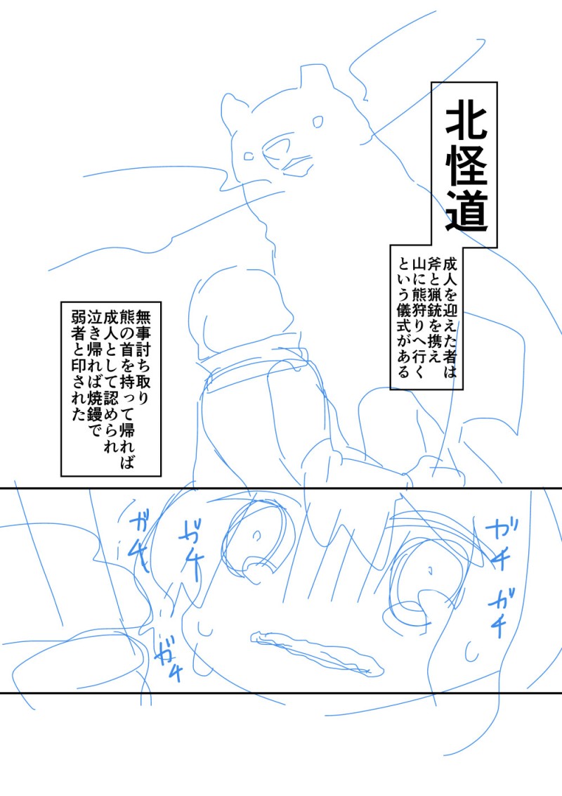熊狩り女子。全部で8ページ。下書き。