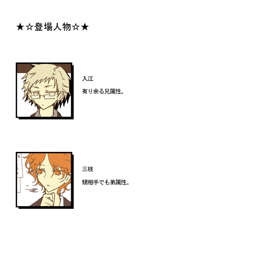 おさかな☆quiet followREHABILIタロットネタ1枚『教皇』と、おまけ1枚 show all(+2 images) Tap to full screen (size:500x500).Repost is prohibited おさかなDOODLE3月2日が誕生日だったので 2 おさかなDOODLE三枝が「本当は寒色の方が好きなんだけど髪色のせいで似合わなくて…」と言うので「そうか?試しにこれ着てみるか?」ってなって互いのスーツ一式(折角なので眼鏡も)交換してみたという小話を絵にしてみたもの 2 おさかなTRAININGなんとなく描いた三兄弟の長男 2 おさかなDONE叔父とその友人の協力による愉快な甥っ子撮影会 2 おさかなDONE推しのプレゼン 入→三編 2 おさかなDONE推しのプレゼン 東→三編 2 recommended works paul_saniwaDOODLE怪物α げんみ×エンドCネタバレ有のラフpass ok 2 ALTDOODLE🔞表格.. 2 げぼくDOODLE 3 Octocomics-BLDOODLE yourei_s19DOODLEタカ丸さんとキスしてるだけ ぎうにうぷりんDONEベルばらパロ(?)なリリアちゃんw(※本編にこんなセリフはありません) biya_hiSPOILER野狗子と薬師げんみ❌表情の二面性 3 akindo0308TRAINING横顔首筋練習。チヒ伯チヒロは伯理の体液全部舐め取ってくれ あとらDOODLE何かこの2人ずっと漫才してんな……………… 2