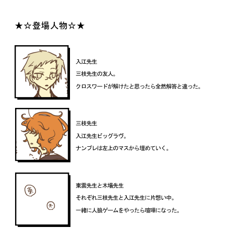 おさかな☆quiet followDONE推しのプレゼン 木→入編 show all(+1 images) Tap to full screen (size:500x500).Repost is prohibited おさかなDOODLE3月2日が誕生日だったので 2 おさかなDOODLE三枝が「本当は寒色の方が好きなんだけど髪色のせいで似合わなくて…」と言うので「そうか?試しにこれ着てみるか?」ってなって互いのスーツ一式(折角なので眼鏡も)交換してみたという小話を絵にしてみたもの 2 おさかなTRAININGなんとなく描いた三兄弟の長男 2 おさかなDONE叔父とその友人の協力による愉快な甥っ子撮影会 2 おさかなDONE推しのプレゼン 入→三編 2 おさかなDONE推しのプレゼン 東→三編 2 recommended works 博物少女志DOODLE BLACKHOLEDOODLE 温泉卵DOODLE数字 2 L23lTg5DOODLEfwくん不在ですが、fwhrです goma_tan_tanDOODLEVincent しん・アナログ練習TRAINING2025.2.252.24分https://www.posemaniacs.com/tools/viewer/poses/01GBVYHZ5WBJHECQRXDSNTQZQV本日分https://www.posemaniacs.com/tools/viewer/poses/01HJJJMDC8WV0W70GS5T3A147V 7 mitumintsDOODLE現行未通過 NG自陣 NG秘匿情報ありHO2「二階堂 皐」目線の小説 1548 じょんMOURNING博休🔞ふにゃふにゃでしっくりこねぇなぁ…って煽られたい 310(さとう)MEMO250225今日は夏服の撮影してたよーうちの子、かわいい…おやつは梅あじのやつ 2