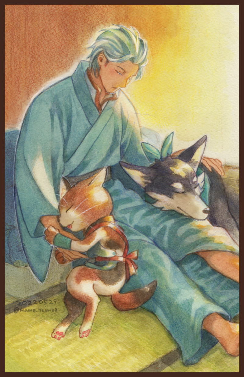 版権)午睡をしている自ハンター♂さんとオトモたちの絵です。