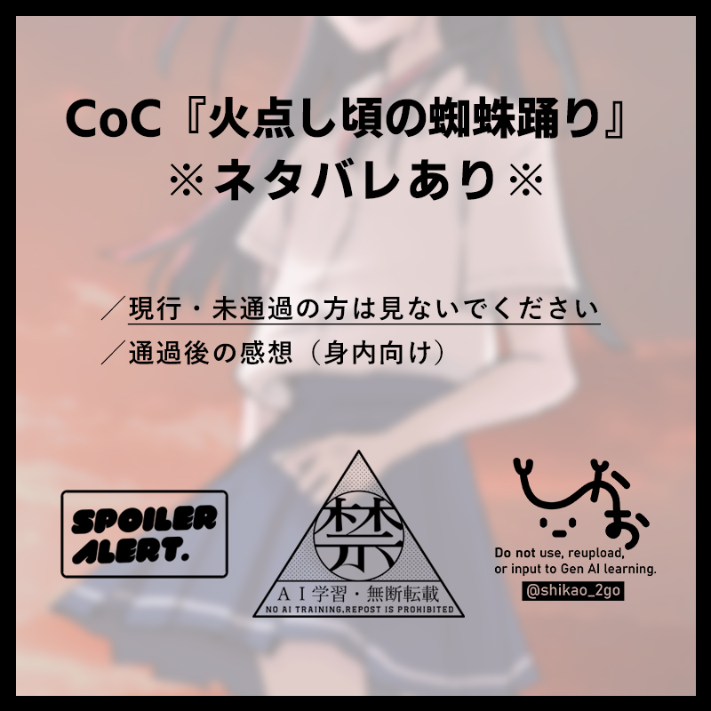 shikao_2go☆quiet followSPOILER後日(自陣にしか伝わらない内容&オチも何もない)※CoC『火点し頃の蜘蛛踊り』(HO1)のネタバレを含む内容のイラストです※現行・未通過の方は見ないでくださいパスワード→yes show hide show all(+2 images) Tap to full screen (size:800x800).Repost is prohibited Let's send reactions! freqpopularsnackothersPayment processing Replies from the creator Follow creator you care about!☆quiet follow shikao_2goSPOILERCoC『ニトロとレモン』でKPをする際に作成したスチル・立ち絵のまとめです。※シナリオのネタバレになる内容を含みます※現行・未通過の方は見ないでくださいパスワード→yes 9 shikao_2goSPOILERCoC『拝啓、愛しの『』へ』でKPCをする際に作成した素材のまとめです。※『海が枯れるまで』継続のため、『海枯れ』と『拝啓~へ』のネタバレを含みますので、現行・未通過の方は見ないでくださいパスワード→yes 4 shikao_2goSPOILERCoC『ニトロとレモン』でKPをする際に作成したスチル・立ち絵のまとめです。※シナリオのネタバレになる内容を含みます※現行・未通過の方は見ないでくださいパスワード→yes 10 shikao_2goSPOILERKPなのに位置感の把握ができなさすぎて1度マイクラでマップを作ってそれを元に背景+αを描いたものです。結構荒くて見難いので描き直したい。※CoC『壊胎』のシナリオ内でのネタバレになる内容を含みます※現行・未通過の方は見ないでくださいパスワード→yes 19 shikao_2goSPOILERCoC『壊胎』でKPをする際に描かせてもらった立ち絵+αまとめです。※シナリオのネタバレになる内容を含みます※現行・未通過の方は見ないでくださいパスワード→yes 8 shikao_2goSPOILERCoC『帝都東京因辺留濃』でKPをする際に作成した素材のまとめです。※シナリオのネタバレになる内容を含みます※現行・未通過の方は見ないでください※『夜往々ノ騒話』の継続ですが、『夜往々』のネタバレは含みませんパスワード→yes 9