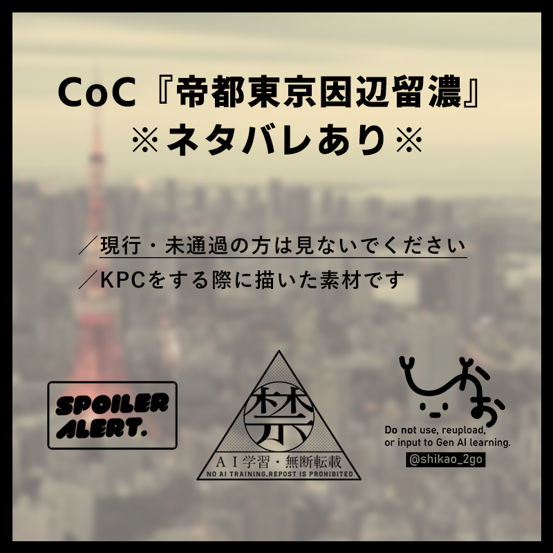 shikao_2go☆quiet followSPOILERCoC『帝都東京因辺留濃』でKPをする際に作成した素材のまとめです。※シナリオのネタバレになる内容を含みます※現行・未通過の方は見ないでください※『夜往々ノ騒話』の継続ですが、『夜往々』のネタバレは含みませんパスワード→yes show hide show all(+8 images) Tap to full screen (size:800x800).Repost is prohibited Let's send reactions! freqpopularsnackothersPayment processing Replies from the creator Follow creator you care about!☆quiet follow shikao_2goSPOILERCoC『ニトロとレモン』でKPをする際に作成したスチル・立ち絵のまとめです。※シナリオのネタバレになる内容を含みます※現行・未通過の方は見ないでくださいパスワード→yes 9 shikao_2goSPOILERCoC『拝啓、愛しの『』へ』でKPCをする際に作成した素材のまとめです。※『海が枯れるまで』継続のため、『海枯れ』と『拝啓~へ』のネタバレを含みますので、現行・未通過の方は見ないでくださいパスワード→yes 4 shikao_2goSPOILERCoC『ニトロとレモン』でKPをする際に作成したスチル・立ち絵のまとめです。※シナリオのネタバレになる内容を含みます※現行・未通過の方は見ないでくださいパスワード→yes 10 shikao_2goSPOILERKPなのに位置感の把握ができなさすぎて1度マイクラでマップを作ってそれを元に背景+αを描いたものです。結構荒くて見難いので描き直したい。※CoC『壊胎』のシナリオ内でのネタバレになる内容を含みます※現行・未通過の方は見ないでくださいパスワード→yes 19 shikao_2goSPOILERCoC『壊胎』でKPをする際に描かせてもらった立ち絵+αまとめです。※シナリオのネタバレになる内容を含みます※現行・未通過の方は見ないでくださいパスワード→yes 8 shikao_2goSPOILERCoC『帝都東京因辺留濃』でKPをする際に作成した素材のまとめです。※シナリオのネタバレになる内容を含みます※現行・未通過の方は見ないでください※『夜往々ノ騒話』の継続ですが、『夜往々』のネタバレは含みませんパスワード→yes 9