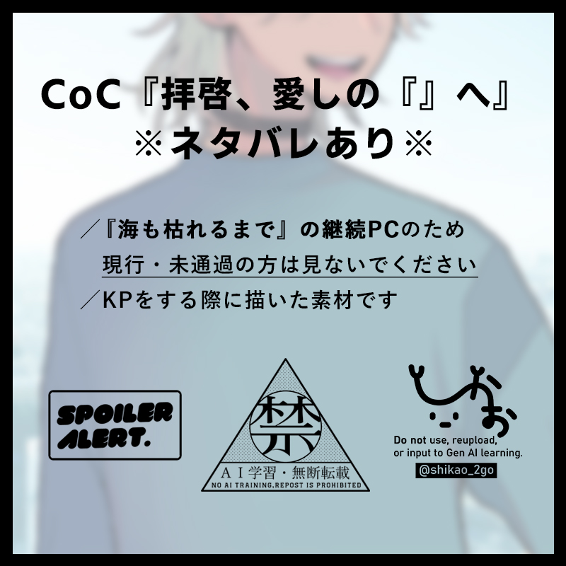 shikao_2go☆quiet followSPOILERCoC『拝啓、愛しの『』へ』でKPCをする際に作成した素材のまとめです。※『海が枯れるまで』継続のため、『海枯れ』と『拝啓~へ』のネタバレを含みますので、現行・未通過の方は見ないでくださいパスワード→yes show hide show all(+3 images) Tap to full screen (size:800x800).Repost is prohibited Let's send reactions! freqpopularsnackothersPayment processing Replies from the creator Follow creator you care about!☆quiet follow shikao_2goSPOILERCoC『ニトロとレモン』でKPをする際に作成したスチル・立ち絵のまとめです。※シナリオのネタバレになる内容を含みます※現行・未通過の方は見ないでくださいパスワード→yes 9 shikao_2goSPOILERCoC『拝啓、愛しの『』へ』でKPCをする際に作成した素材のまとめです。※『海が枯れるまで』継続のため、『海枯れ』と『拝啓~へ』のネタバレを含みますので、現行・未通過の方は見ないでくださいパスワード→yes 4 shikao_2goSPOILERCoC『ニトロとレモン』でKPをする際に作成したスチル・立ち絵のまとめです。※シナリオのネタバレになる内容を含みます※現行・未通過の方は見ないでくださいパスワード→yes 10 shikao_2goSPOILERKPなのに位置感の把握ができなさすぎて1度マイクラでマップを作ってそれを元に背景+αを描いたものです。結構荒くて見難いので描き直したい。※CoC『壊胎』のシナリオ内でのネタバレになる内容を含みます※現行・未通過の方は見ないでくださいパスワード→yes 19 shikao_2goSPOILERCoC『壊胎』でKPをする際に描かせてもらった立ち絵+αまとめです。※シナリオのネタバレになる内容を含みます※現行・未通過の方は見ないでくださいパスワード→yes 8 shikao_2goSPOILERCoC『帝都東京因辺留濃』でKPをする際に作成した素材のまとめです。※シナリオのネタバレになる内容を含みます※現行・未通過の方は見ないでください※『夜往々ノ騒話』の継続ですが、『夜往々』のネタバレは含みませんパスワード→yes 9 recommended works kote3stloDOODLEクラウスは大将首だし、この2人が出会ったら死闘になりそう 博物少女志DOODLE 910HM_tsukiyoTKDOODLEチッス練落書きんちょ ゆきみちゃんDONE居眠り リサミDOODLEthe password is the answer to the question:are you over 18? 🔞(yes/no) 饿饿饿死了DOODLEMEOW SCrapIronDOODLE蓮の空rkgk 血まみれの画像とRPSを含むパスワードはyes 4 沈云渊TRAINING📸牛柄猫の笑颜を见て、整个春が愈されました~🥰 AIツールを使ってこれらを作成しました。キーワードを记记载すると生成できるので、その后対话によって加工して修改し......不足がある場合はご容赦ください! AI:octocomics.com/home 4 STLVNDONEday40=Red thread(Commissioned work, the artist requested not to reveal their name) 2