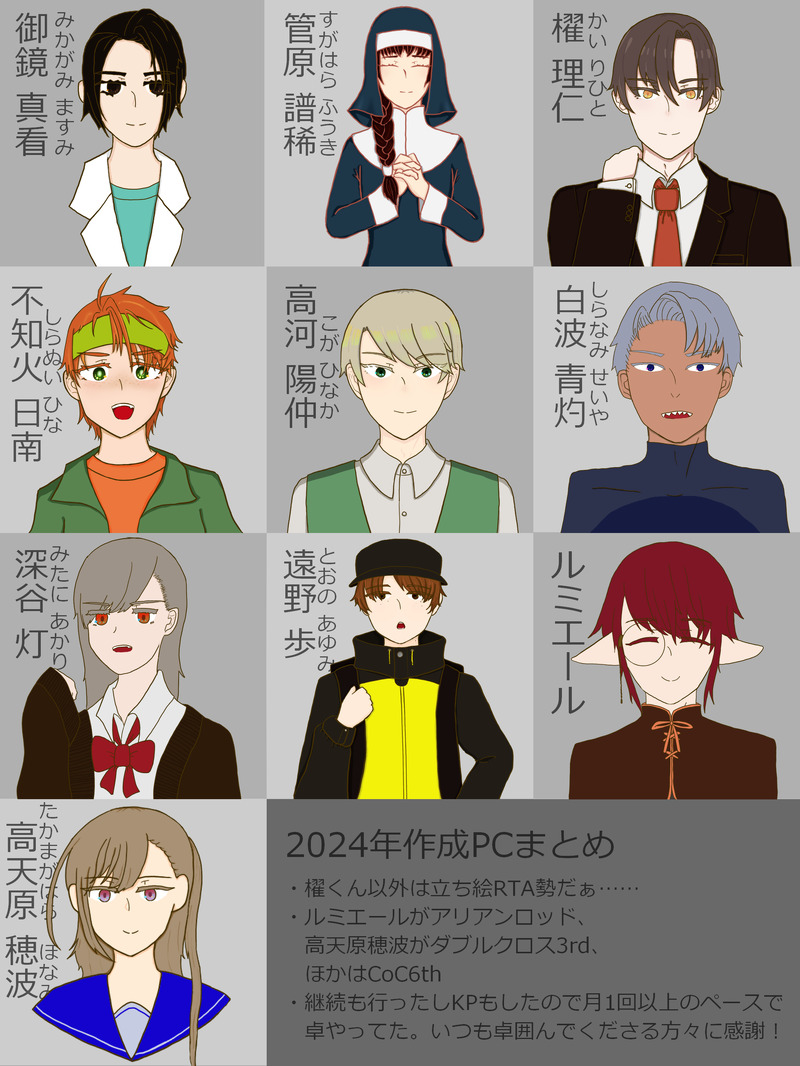 ゐるぶみ/セサミ☆quiet followDOODLE2024年のらくがきとかまとめ(自PC中心、たまに同卓PCがいる)ネタバレはない show all(+8 images) Tap to full screen (size:2100x2800).Repost is prohibited Let's send reactions! freqpopularsnackothersPayment processing Replies from the creator Follow creator you care about!☆quiet follow ゐるぶみ/セサミSPOILER普段の差分とショタ化差分の比較。2枚目はセッション終了後に見た方が味があるかも……との気持ちでネタバレ設定ワンクッションにしときます。パスワードは櫂くん(ショタのすがた)の身長3桁 2 ゐるぶみ/セサミSPOILERWish-Sunrise 二次創作SS【祈りとは人の、】DX3rd 非公式シナリオ【Wish-Sunrise】のネタバレを多分に含む二次創作SSです。パスワードはとあるNPCの名前(3文字)解釈違いあったら申し訳ないのですが、二次創作ということで許せる人だけ読んでね!! 2302 ゐるぶみ/セサミDOODLEVOIDのHO3同士で行った「僅差平行のヴェルダンディ」でかいたらくがき1枚目以降ちょっとネタバレがあるので両シナリオ完走済み向け 5 ゐるぶみ/セサミDOODLE2024年のらくがきとかまとめ(自PC中心、たまに同卓PCがいる)ネタバレはない 9 ゐるぶみ/セサミDOODLEダブルクロスThe 3rd Edition 『Wish Sunrise』の思い出をつめこんだらくがき。ネタバレ要素があります。描いた順に雑に入れてる。 17 ゐるぶみ/セサミMAIKINGVOID二次創作SS(タイトル未定)未完ガッツリネタバレあるので完走済み向けパスはシナリオ中西暦数字 605 recommended works かちくDOODLE自探索者、怪盗バージョン2枚目はおまけのオフモードと並べてみた 2 ショタコン紳士MOURNING陽太くんの同居人用全身立ち絵ですが単にSAN値顔が多いってだけで別にネタバレでは…ない。 18 mermeimuMOURNINGカニバリスト殺人鬼ヴィンセントの殺人SS2本立て2019.0711 13 かちくDONE「夜明けを待たぬ灰被り姫」HO魔女嬉々としてオネエさん(成人男性)を作りました 2 かちくDONE「名探偵黒猫と大怪盗キャッツ」お友だちの探偵組の立ち絵描かせていただきましたー! 3 かちくDONE「エンジェル・デビル・インプロパー」HO天使 2 たぐい*DOODLECoC『ホルマリン漬けの心臓』たのしかったな…… trpgbtnDOODLEVOID げんみ❌ TRPG_FireMSPOILERAconite げんみ× HO2は〇HO2に狂った結果始まった1日1CP絵㉖※腐注意 4