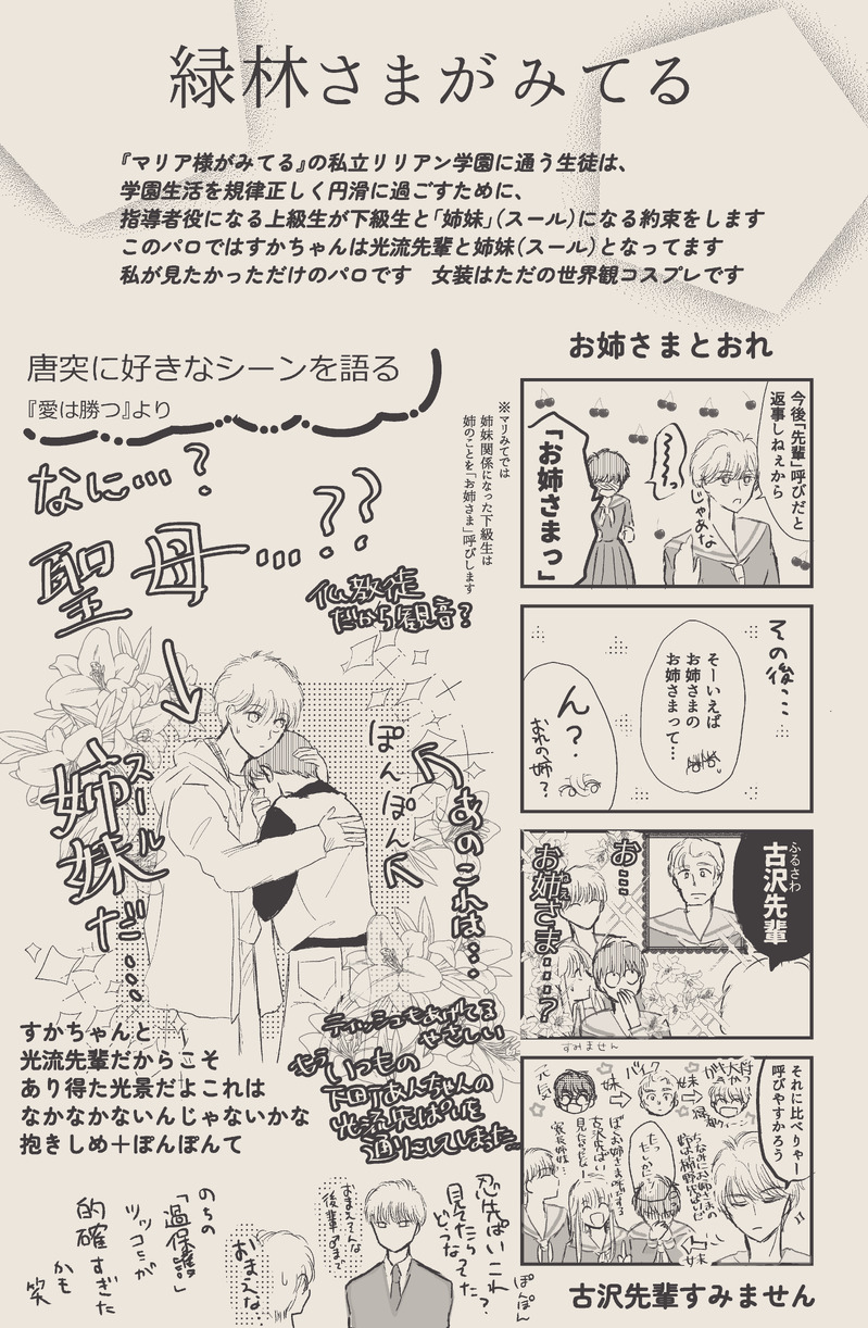 tori☆quiet followDONE『緑林さまがみてる』※女装ありマリア様がみてるパロ。光流先輩とすかちゃんの兄貴分子分コンビがほほえましくて好きで、マリみてでいう姉妹(スール)っぽいなぁ~と思ったので描いた。あのぽんぽん、すごくやさしいなと思いました。 Tap to full screen (size:4176x6384).Repost is prohibited Let's send reactions! freqpopularsnackothersPayment processing Replies from the creator Follow creator you care about!☆quiet follow toriMEMO『理想の…』もちまわりシンデレラの光流先輩の「似ている…!」発言の真意予想。光流先輩は理想の強い女性(義母)を探していたがいろいろあって、何故か好きな子は似ても似つかぬ男の忍先輩でまたそっからいろいろいろいろあって、恋人になり、最終形態のS先輩は……限りなく養父似であったとさ。めでたしめでたし。『知らず愛する家族を再現してしまうM先輩の図』 5 toriDONE『いる』正くん…彼の大好きな義兄は…もう…最低でも元旦〜5日まで、光流先輩実家に連泊する忍先輩おもしろ痛快です。おれの居場所はここに決めた!✨の割り切りの意思を感じます。すかちゃん(正月早々他人を泊めてほしいっつーのはちょっと悪いよなやっぱり😓)をこの形の回収最高です。相手んちにたくさん泊まるの『三日夜の餅』を連想します。迎え入れられ泊まってヨメ(ムコ)におさまる怪異とか… 5 toriDONE『元寮生はペース配分を心得ている』同居。 2 toriDOODLE『世界でいちばん萎えるやつ』きっと忍光。両者いちばんげんなりするプレイかな…と…。 4 toriDONE『受け攻め攻防戦』🌻⛄️?🌻?いえるよーになったのね。 10 toriDONE🍫🎂お礼絵集です。メッセージありがとうございます!! 5 recommended works toriDOODLE『交渉』(なんだかんだ初回だからと気を張っていたかもしれないS先輩)「あとででも」って未来があってうれしいよね。すき(愛)なかしたい(愛+趣味) 4 narururunnDOODLEpass: 1 9709 ⚠️倉庫DOODLEハロウィン囚墓可愛いからsexさせる!!って気持ちで描きましたが二人とも裸なので添える程度になってしまいました。懺悔pass 18↑?(yes/no) TRPGfairy_1109DOODLE蠍座とおしゃぶり(⁉️) Lycoris6DOODLEver7.3開始早々爆弾💣シーンのサブ達の落書き きりんDOODLE 6 aohaDOODLEイトアキR18 4 xingxiaoclemDOODLE望余给力图 kinapien_5DONEオンリー展示作品瑛主漫画