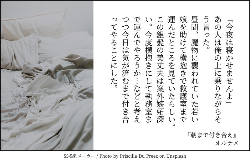 いぬ🐕🦺☆quiet followDONEオルテメSS140文字『朝まで付き合え』 #オルテメ Tap to full screen (size:910x590).Repost is prohibited Let's send reactions! freqpopularsnackothersPayment processing Replies from the creator Follow creator you care about!☆quiet follow いぬ🐕🦺PAST⚠️何でも許せる人向け。本当に、本当に何でも許せる人向けです。オルトは裁縫が楽しい。布があるから、縫う。ミシンがあるから、仕立てる。例えそれが透け透けランジェリーでも…。 2273 いぬ🐕🦺PAST⚠️深く考えてはいけないシリーズ。本当に、本当に何でも許せる人向け。極度に頭のネジが緩い。全員健在で3Pなどしている爛れた次元の話。怒らないでくださいね。パスワード18歳以上ですか?はい/いいえ 2555 いぬ🐕🦺PAST⚠️何でも許せる人向け。本当に、本当に何でも許せる人向けです。クリックとオルトが聖堂機関のとんでもない年始行事の練習に勤しむ話。 2238 いぬ🐕🦺MOURNING美味しんぼネタ客帰ってから本当の白雪シチューをせっせと仕込むオルト君。「俺が思う最強の白雪シチュー」を渾身の出来栄えで作ります。翌日、再来した客が「こんな旨いシチューは食べた事がない…いや、そやない、何十年か前に食べた記憶がある。旨い、ほんま旨い…」と涙を流し「それに比べるとテメノスはんのシチューはカスや」とテメさんのあっさりシチューに難癖つける場面は胸熱です。 いぬ🐕🦺PASTオルテメ的なもの。 いぬ🐕🦺DONEオルテメSS140文字『ハマっちゃいそう』 related works いぬ🐕🦺DONEオルテメSS140文字『この身を委ねてもいい』 mizuDONE騎士サンドって中々見ないからついホリデーシーズン用に 2 いぬ🐕🦺DONEオルテメSS140『後悔していますか?』 いぬ🐕🦺TRAININGオルテメ。全く幸せではない朝ちゅん。事故みたいなもん。 いぬ🐕🦺DONEオルテメSS140文字。『条件付き恋人』 くずばこMEMO小説ではないです。テメノス4章後前提なので多少配慮はしていますが一応ネタバレ注意。サイト名:TOY様(http://toy.ohuda.com/)よりお題をお借りしました。 3928 stickey_gameDONEオルテメです。2人が過去を乗り越えて結ばれる話。テメを中心に話が進んでいきます。時間軸は本編ストーリー後となっています。以下注意です・ロイと教皇が出て来ます(口調はゲーム内を参考にやや捏造しています)・ブロマンス程度のクリテメ最後はオルテメハッピーエンドとなりますのでどうぞ宜しければご覧下さい 7820 かなえDONE例のスケスケインナーでオルテメR-18です。着衣っていいよね。あなたは18歳以上ですか?(yes/no) 4803 いぬ🐕🦺DONEオルテメハグの日SS