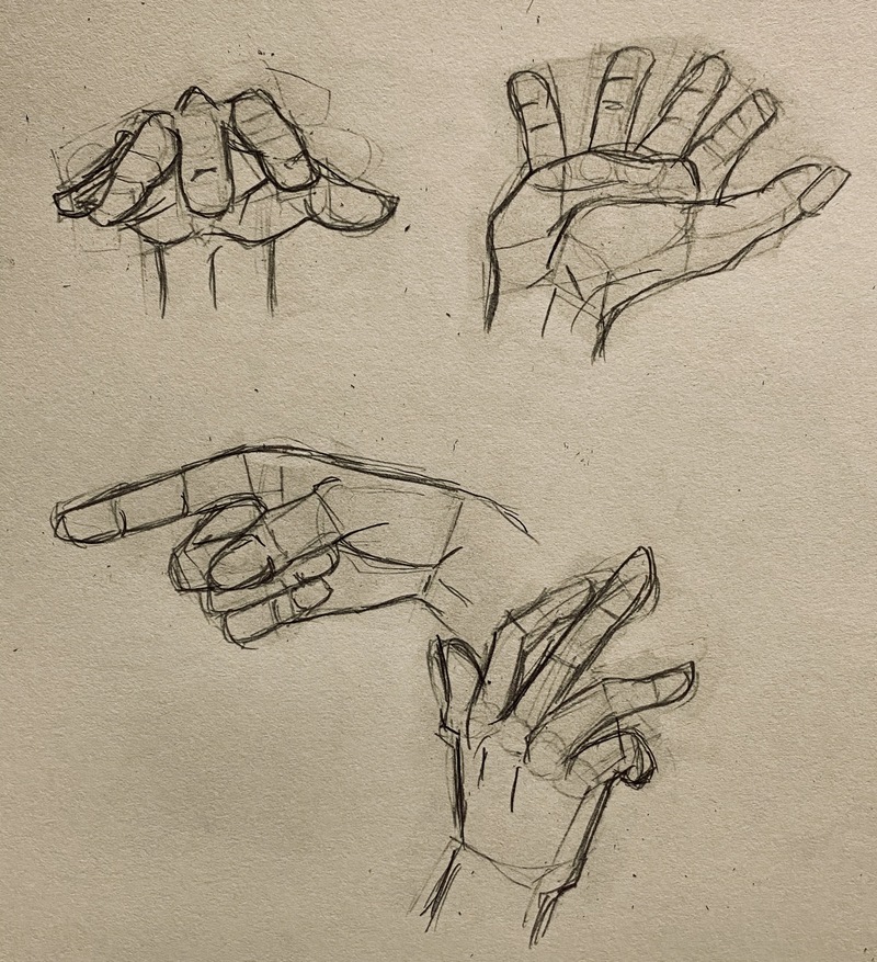 あまりに手が描けないからフォロワーに相談したら、最初は手袋でアタリ、次にその内側にブロック状に組み上がった指を配置、その輪郭をなぞるように描くのを勧められた