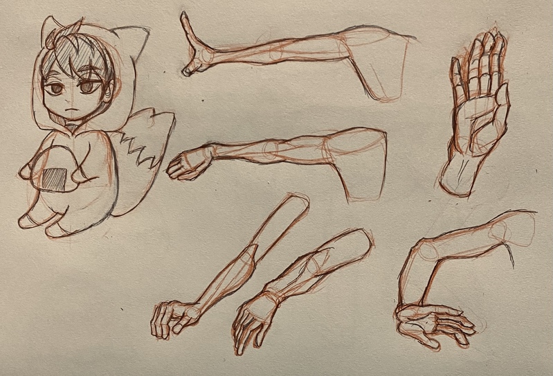 手首が平べったくなって、肩に向かうにつれて筒状になっていくってイメージは頭の中にあるんだけど、描こうとするとどうにも全てが平面になるのと、手の部分から手首、腕にかけての繋がりが曖昧でバランスが気持ち悪くなる