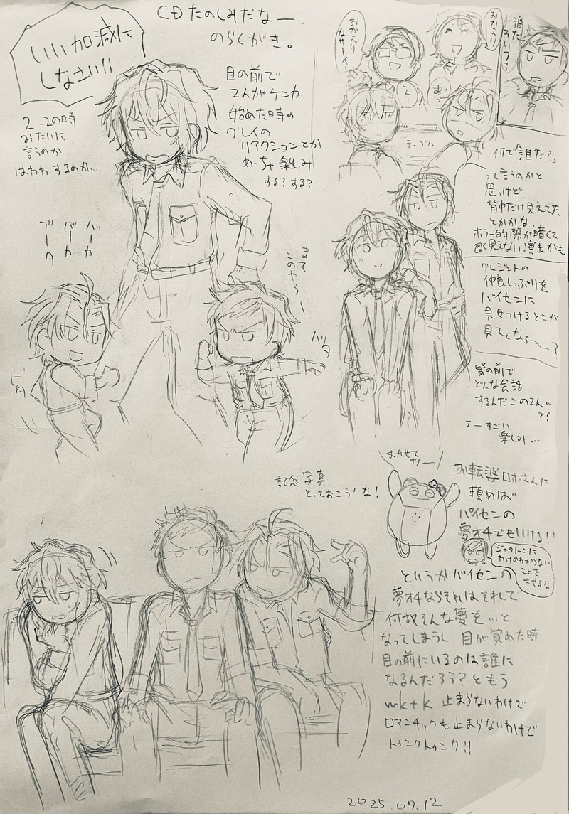 つぶすけ☆quiet followDOODLE試聴聴いてハッスルした時の落書き。こんなの考えてられるのCD出るまでだから。楽しみだなぁ〜20250712 Tap to full screen (size:1520x2176).Repost is prohibited Let's send reactions! freqpopularsnackothersPayment processing Replies from the creator Follow creator you care about!☆quiet follow つぶすけDOODLE他のカプやコンビだとこうはならんのですが、強弱だとなんか司令が絡みに行ってしまう。アッシュパイセンは自分を組み敷くほどの気概を持ったグレイが好きだろうし、グレイは受けでも尚プライド高いアッシュパイセンが好きだと思うんだよな。そういうのが私が好きなだけですが。司令は塩対応して欲しいですが、それだと描写と齟齬が出るからモブおじさんの方がいいのかもしれない。私はモブおじさんになりたい。 つぶすけDOODLEメイドグジェッさんの好きなところ言いたい。リボン🎀とフリフリ大好き!グレイメイド服、胸元のリボンでオタクっぽいメイドになっている気もする。 つぶすけDOODLE洋館ミステリーが楽しみすぎるんじゃ!!!ジェットさんがメイド服(給仕です)を着るのが確定となった今、描いて出すしかないじゃない!!!ストーリー読むまでしか出来ない妄想をするなら今の内!シュッシュッ!洋館の主人(仮)をSATSUGAIする給仕さんを描くなら今の内!!俺の中では今こうだから!!!オチがない。素直に10コマ漫画にした方が良かったかもしれないと思わなくも無い。 つぶすけDOODLE肩車、そういえば前にさせたな!と思って、肩車からのバックドロップ決めさせたくなっちゃった。こう、こうしてこうなってこう!を考えるのが好き。パイセン、プロレス技がやたら似合う。すーぐイチャイチャさせたくなってしまう。 つぶすけDOODLEクッソ雑だけど、パッションのままに描いた。こう、こういう、こういうの!昼なおくらい怪しげな洋館!何かを隠すメイドさん達!姿を現さない主人!何も起きないはずがなく……良い舞台が整ってきたなぁ!(妄想)イベント前の妄想期間好き。 つぶすけDOODLETwitterに投げてたやつ 4 recommended works po_DONE断っちゃったエの話※イベスト完結前に書いたため違う部分があります 3 หมาหมึกกุ้งDOODLE18↑ (yes/no) CutsanDOODLE人を選ぶ絵。若ルーと友人。宿り木の下で二人だけの音楽祭。 2 RatoskrDOODLEthe switch is now OFF awaawaburoDOODLE謎のぬい、ぶるぽんまとめ2。だんだんブルブルが癖になっていくでしょう?カワイイネェ 10 yuna_mochi_DOODLE あああDOODLE1224-19 yingyingSPUR ME #2024纯日和圣诞•初雪般的圣诞恋歌# 12月24日 16:00代铄发~ tsukumo1DONE執行官センセが🦊の薄氷メンタルをばきばきに踏み抜く話 5
