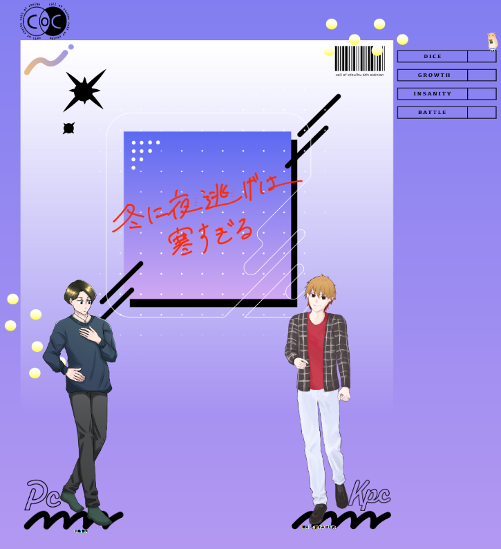 a_trpg_ki☆quiet followINFO𝑪𝒐𝑪「冬に夜逃げは寒すぎる」▿𝑷𝑳[𝑷𝑪]なるこ[手嶋 惣汰]▿𝑲𝑷[𝑲𝑷𝑪]あき[蓮見 一]𝐄𝐍𝐃-𝐀 #TRPG Tap to full screen (size:725x794).Repost is prohibited Let's send reactions! freqpopularsnackothersPayment processing Replies from the creator Follow creator you care about!☆quiet follow a_trpg_kiINFOTRPG 10月の卓スクショ 5 a_trpg_kiINFOTRPG 2025年 9月の卓スクショ 14 a_trpg_kiINFOTRPG 2025年 8月の卓スクショ 14 a_trpg_kiINFOTRPG 2025年 7月の卓スクショ 19 a_trpg_kiINFOTRPG 2025年 6月の卓スクショ 15 a_trpg_kiINFOTRPG 2025年 5月の卓スクショ 16 related works ぽんずDOODLE霧一とロコン誰にも賛同してもらえないことを前提に言うんだけど、なんか似てる気がするんだ…前髪のあたりとか?かわいい今ふと思ったけど、直人はサーナイトとか並べたいな~PC×ポケモンはたまーに見たくなるね 発芽ゴリラPROGRESS何もないのもアレなので立ち絵進捗ポイポイ!前上げたのと大して変わってないとか言わない! #進捗 #TRPG りゅうしDOODLEメカバレ風 みもりよぞらPAST獣人(げっ歯類のチンチラ)のハイプリースト(男の娘)[性格]人懐っこくスキンシップをとるのが好きだが、基本的にインドアで面倒くさがりな感じ きよし@キバ&ウィザード履修中DOODLETRPGで作成したPC 圭(ケイ) 28歳「男娼の限界腐男子」と言う設定 きよし@キバ&ウィザード履修中DONETRPG「デッドラインヒーローズ」のPCキャラ 「オダマキ」身長(ヒール込み)189cmのオネェ みもりよぞらDOODLE現代入りネタで、色々な手違いが重なって某奇祭の御神体に跨る事になった獣人の男の娘、この時期はこの類(子孫繁栄祈願?)の祭りが多いそうで。 小鳥遊PROGRESSハイフェッツ草案 totukiDONEFateTRPGで使ったキャラ絵。オリ鯖オリマスターご注意。 5 recommended works 淵上はくDONECoC新規探索者 2 おみそTRPGDOODLE もちもちDONE目線の先にはスプラッタホラー3秒後にゴンベに触られて飛び上がる 佐久間 和泉DONEカムイカル 4 朝霞たかなDOODLE庭師。Ho2大月くんのお誕生日でした!激辛テロしてすみません。文字なし差分も入れておきます。 2 ichieiDONEソロ・ジャーナリング『Alone on the Hitman Red Eye』進行メモ今日も『Alone Among the Stars』のhackです。KEIRE様が翻訳した日本語バージョンでプレイさせていただきました。Red Eyeってなにか元ネタあるのかなと探したんですが、自分の知識ではとんと思い付きませんでした。昔から赤い瞳は魔女の象徴らしいけど、たぶん関係ないよな。先に断っておくとHitmanではなくなりました。まあかめへんやろ。このまえプレイした『You are a Muffin』だってタイトルにマフィンがあるのに、実際のプレイではマフィンになれる確率は6分の1しかなかったし。https://tubatic.itch.io/alone-on-the-hitman-redeyehttps://keirenorobata.booth.pm/items/3929444 3277 r__043PROGRESS原罪の国 探索者 メリーこんな感じだよっていう進捗提出…ちびっこエンジニアRP全然考えてません t_a_U__SPOILERCoC「VOID」現行・未通過×シナリオネタバレ有ります。voidほいちくん辛辛漫画。しんどいの舞を踊りながら描いた。しんど。 6 水晴-MinaSe-DONEフォルティ・カーレッジ 立ち絵まとめシノビガミ『幻想世界秩序』PC1でございました!楽しかった……本当、映画を浴びたって感じ……ミラワまじでいいぞ……※ネタバレなし※軽い流血あり 32