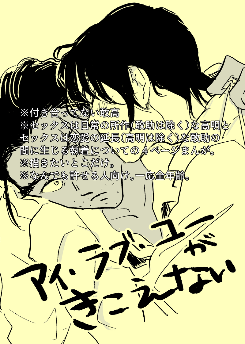 わのけー☆こそフォロらくがき【アイ・ラブ・ユーがきこえない】敢高/全年齢/4p/何でも読める方向けイチャコラする敢高を描きたかったが、なんかこうなった。■パスは会場をご参照ください(ヒント:長野の日) 表示 非表示 すべて表示(+6枚) タップで全画面(原寸:2000x2805)無断転載禁止 リアクションをたくさん送って応援しよう! よく使う人気おやつその他支払処理中 作者からのリプライ 気になる人をどんどんフォローしよう!☆こそフォロ わのけーできた【Nez。】敢高/R18※何でも許せる方向け※敢←由の由衣さんでます■パスは会場をご参照ください(ヒント:長野の日)こちらの話が入った3/2頒布予定の新刊「HIDE AND SEEK」の部数アンケートをしていますので、よろしくお願いします。https://forms.gle/qtxjvSobae5BinYK8 20 わのけーできた【禁断のレーツェル】敢高/R18/何でも読める方向け■パスは会場をご参照ください(ヒント:長野の日)こちらの話が入った3/2頒布予定の新刊「HIDE AND SEEK」の部数アンケートをしていますので、よろしくお願いします。https://forms.gle/qtxjvSobae5BinYK8 23 わのけーできた【なんか、すんでる。】お題漫画。敢高/全年齢※何でも大丈夫な方向け※由衣さんが姿はありませんがふんわいります。■パスは会場をご参照ください(ヒント:長野の日) 30 わのけーらくがき【アイ・ラブ・ユーがきこえない】敢高/全年齢/4p/何でも読める方向けイチャコラする敢高を描きたかったが、なんかこうなった。■パスは会場をご参照ください(ヒント:長野の日) 7 わのけーできた■敢高俺高「Lily」のあとがき#2■※https://poipiku.com/7723306/12389731.htmlのつづき※パスは三國君の幼馴染みの名前「○○」(漢字)です。※なんでも!なんでもOKな方向けです!※俺高、モブの三國君サイドの話です①lily後の俺高②lily後の兄弟③映画後世界線の俺高 21 わのけーできた■敢高俺高「Lily」のあとがき#1■※パスは三國君の幼馴染みの名前「○○」(漢字)です。※#2→https://poipiku.com/7723306/12389737.html※なんでも!なんでもOKな方向けです!※俺高、モブの三國君サイドの話です①lily後の俺高②lily後の兄弟③映画後世界線の俺高 48