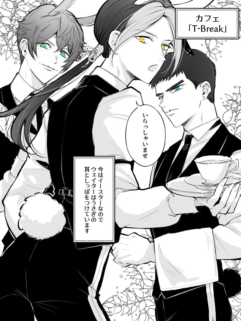 今はイースター期間!そのため3人はいつものウェイター服にプラスでうさぎの耳と尻尾をつけているのです!
