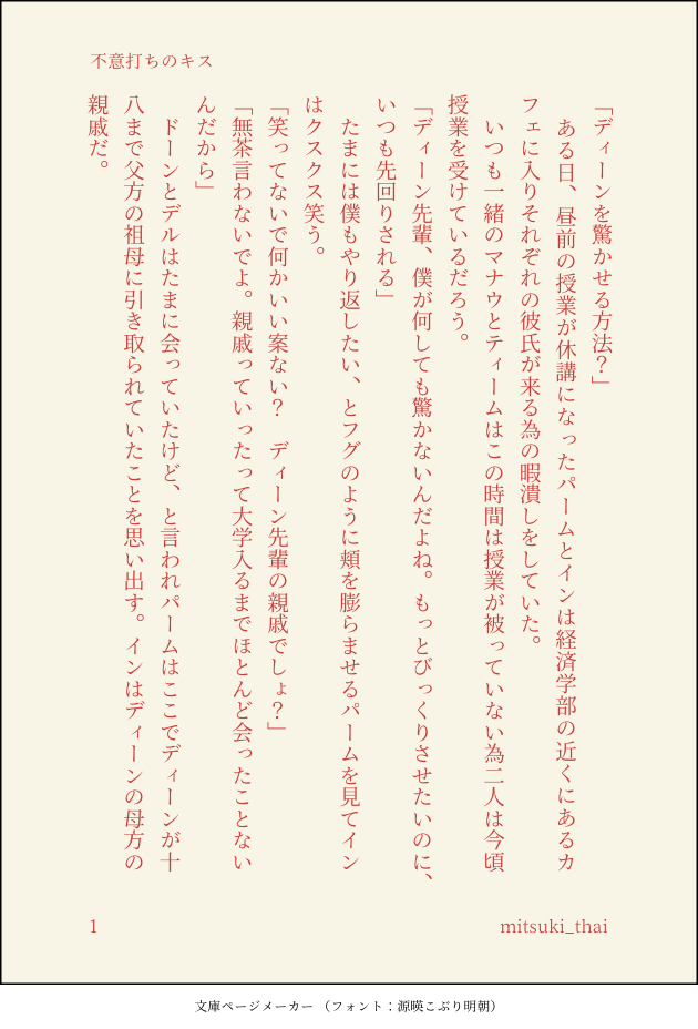 Deanはこういうとき、一歩引いた場所にいる。以前は誰も寄せ付けないオーラを放って差し入れを受け取ったり、そのままPharmに食べさせてもらったりしていた。それが気恥ずかしいやら申し訳ないやらで、見かねたPharmは部員用とは別のタッパーにDeanの分を取り分けることにした。そうして部長の差し入れ寡占状態がPharm寡占状態に変わったことで、水泳部は晴れて心置きなくおやつにありつけるようになった。おそらくこの経緯を分かっていて、Deanは部員たちから少し離れたところでPharmを待っている。Pharmの視界に恋人がやってくることに気づいて、微笑みを浮かべた部長が見えた。