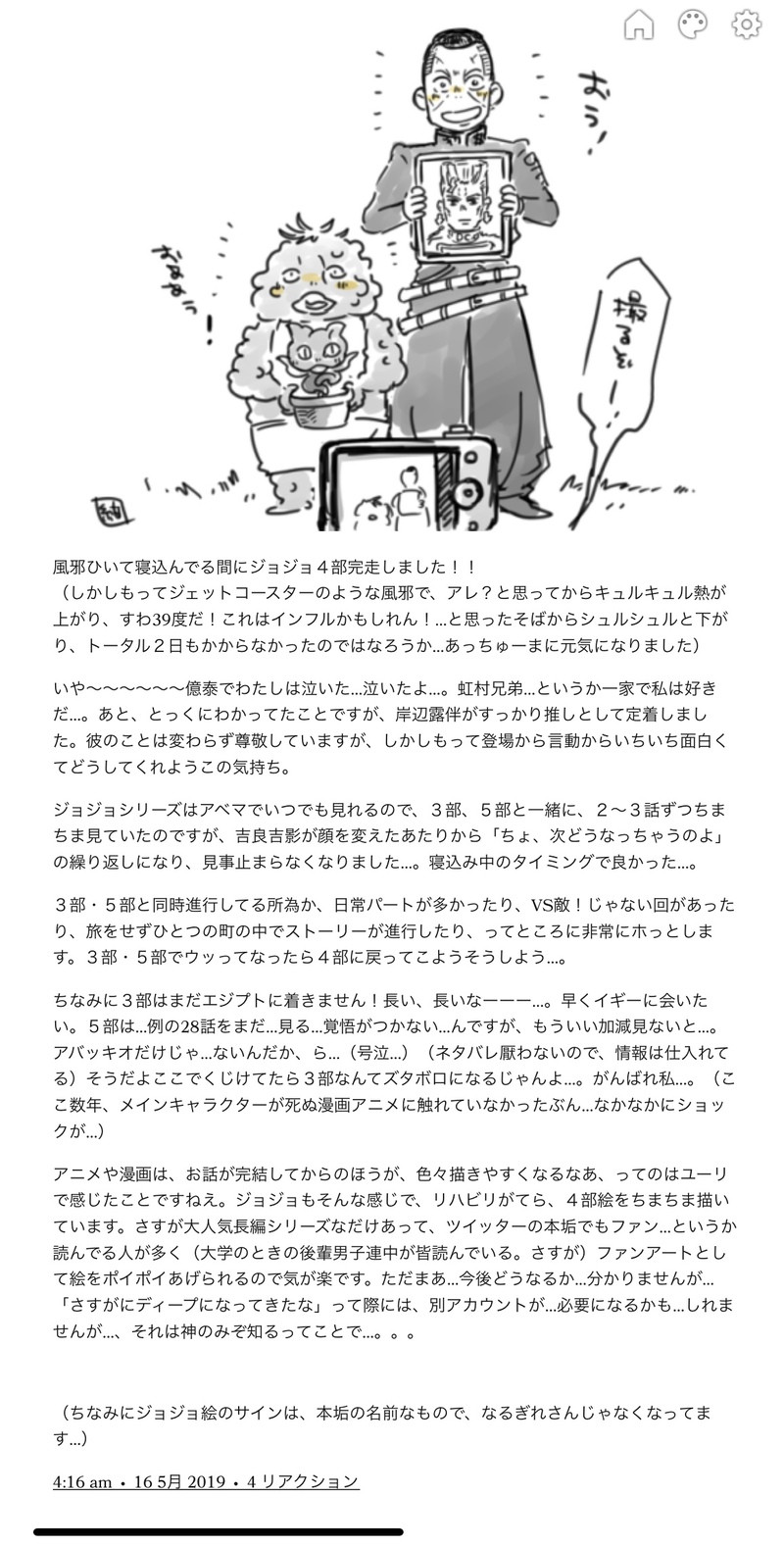 なるぎれ☆quiet followMEMO4部アニメ見終わったよ感想を発掘したので、メモリアル的に置いておこう…。 #ジョジョ jojo. Tap to full screen (size:1156x2279).Repost is prohibited Let's send reactions! freqpopularsnackothersPayment processing Replies from the creator Follow creator you care about!☆quiet follow なるぎれDONEそして大ダークきっかけに、ずっと気になってたドロヘドロを視聴(アニメ)。2日で完走しまして、すっかり煙ファミリーが大好きになって帰ってきました。2期はやらないのかな…アニメ…。 なるぎれDONEみぼすぱんが食べたい!!から大ダークを読み始めました(逆だよ…)原作読む前にみぼすぱんの材料を買ってしまったので(逆だよ…)かなり不完全なみぼすぱんになってしまいました。反省です。胃が元気な時に再チャレンジしたいです。(あとにににめしも作りたい)※サインは別名義のほうのソレ 3 なるぎれDOODLEBloodborneの中で一番ときめいたのはヤーナムの影でした…。 なるぎれDOODLEあと、『アルバの冒険』ってゲームも良きだったので、これまた描いた…。地中海版ぼくの夏休み(副題:自然を守ろう!)みたいな感じ〜。生物のデフォルメが上手で、生物の動きがめちゃリアルで、環境ごとの生態系があるのも良きで、環境音とBGMがこれまた良きで、何よりグラフィックがすんごい良いので、ぜーひー 2 なるぎれDOODLEthe last camp fire ちゅうゲームがとても良きだったので思わずウワーーーーって描いた。本当は実際に映像見てほしい…。。。 2 なるぎれDOODLE羅小黒戦記円盤化だーーーーーーーーー!!!!!!!!!!で描いたのがこれかい。朝イチにメイトにて予約しました👍👍👍 2 related works フリンMAIKING♪︎細かくて細かくて(手が)震える~完成思うほどツラく感じて~ きららDONEお相手:❄️お題「照れ隠し」#jo夢版ワンドロワンライ私の中で❄️はピュアボーイの代名詞!ちょっとあまのじゃくなお話。 フリンDOODLE❄❄❄ギアッチョ❄❄❄ komehazesukiPROGRESSプロシュートの兄貴好きなのでアイコン変えるために作成中渋めの色合いにしてみる作業BGMは中森明菜ちゃんのSAND BEIGE砂漠 もぐもぐ/ぱんDOODLEDIOさま肩幅が狭くなっちゃった 鈴原あかみDONE *mirin*DOODLEぼくのうちにはぼくとおかあさんとおとうさんとそれからめろーねがいます カリンパ㊷DONE「花ありがとな お前さんはこっち来んじゃねーぞ」アニオリのジョルノによる花畑でさらに泣きました。ありがとうアニメスタッフ🌻 🩸DOODLE髪型はこっちが好き目はこっちが好きってしてると1ミリも似なくなった・・・・二枚目は余計なもの取り除いたやつです 2 recommended works 🍣すがみちる🍣DOODLE夏に描いた落書き集です(ジョジョのみ)#ジョジョ #ブチャラティ #5部 7 人類生肉DOODLE友達がイルーゾォはうさちゃんって言ってた🐰 木内 忍TRAININGブラシとかの試し描き🤐🍈 LysTRAINING fubuki_kPAST henriDOODLEおひるねじょせふとし~ざ~ちゃあんとタオルケット掛けるやさしさ手ブロから 2 sapporoumaiPAST #ジョジョ#ジョセフうさみみジョセフ可愛いからみんなかいて〜 のどかPAST一時期流行ったヤツ😁 6 てんは天ぷらが好きDOODLE定助康穂ちゃんハッピーバレンタイン!https://twitter.com/ten_dondondon/status/1228281286860500992?s=19