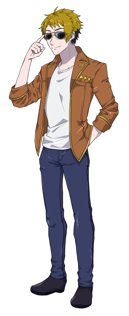 デレク=ターナーの立ち絵です。出身がアメリカ、職業が用心棒ということでちょっとラフでシンプルな感じに。グラサンしてても表情豊か。ちょっと日光に目が弱いのでグラサンしてます。