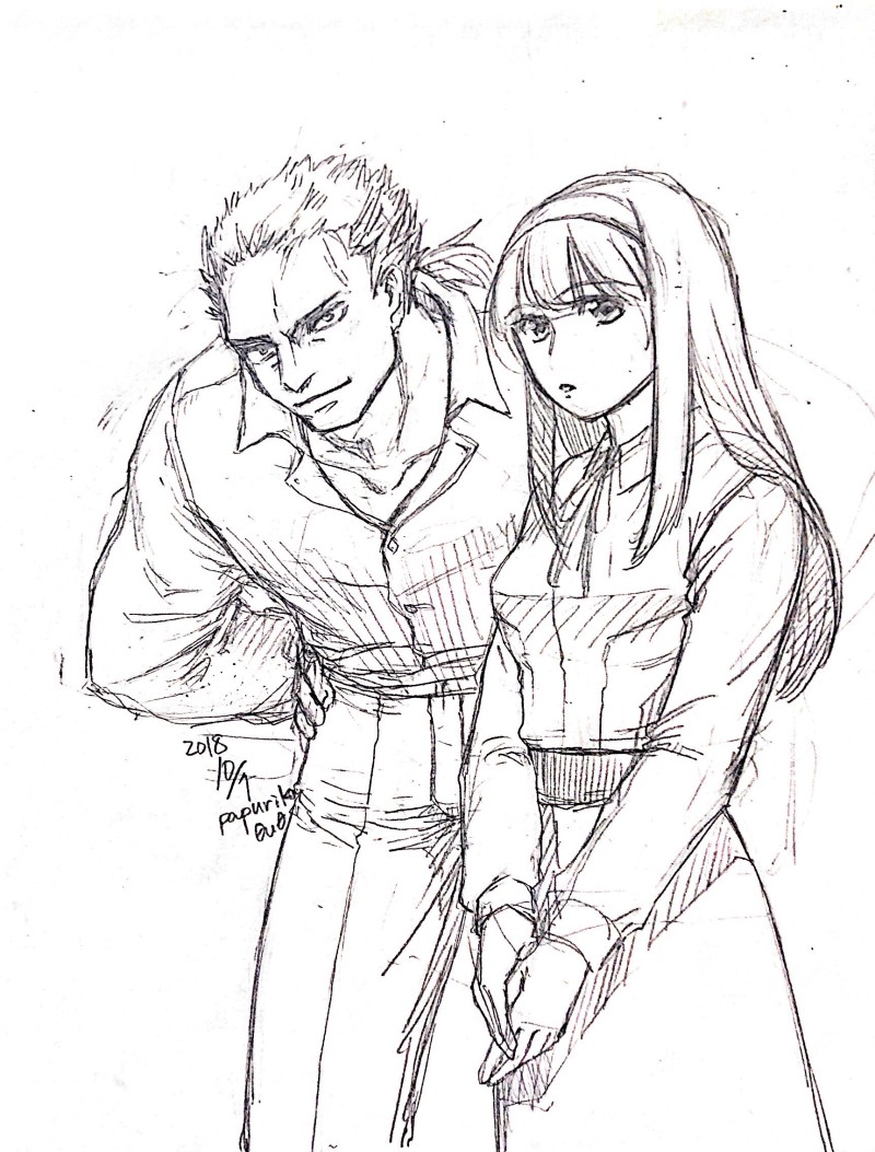 描くのが(比較的)楽かつ好きなタイプの女の子(160センチちょいイメージ)と、好きなタイプなのに描くのがすこぶる苦手な筋肉系男性(2メートル前後イメージ)