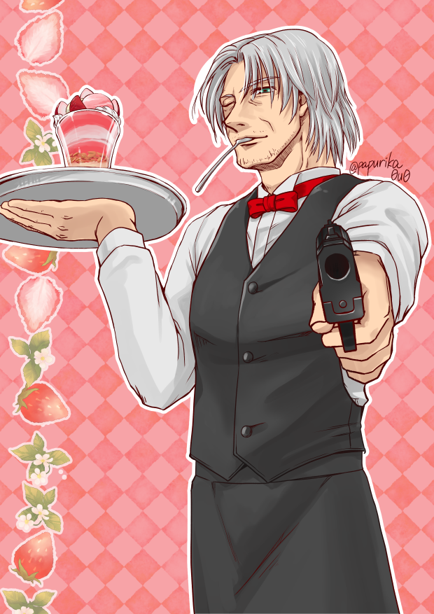 ダンテさんをどのくらいの老け加減で描いたらいいのかわからないまま描いたカプコンカフェ楽しかった思い出を乗せた絵。