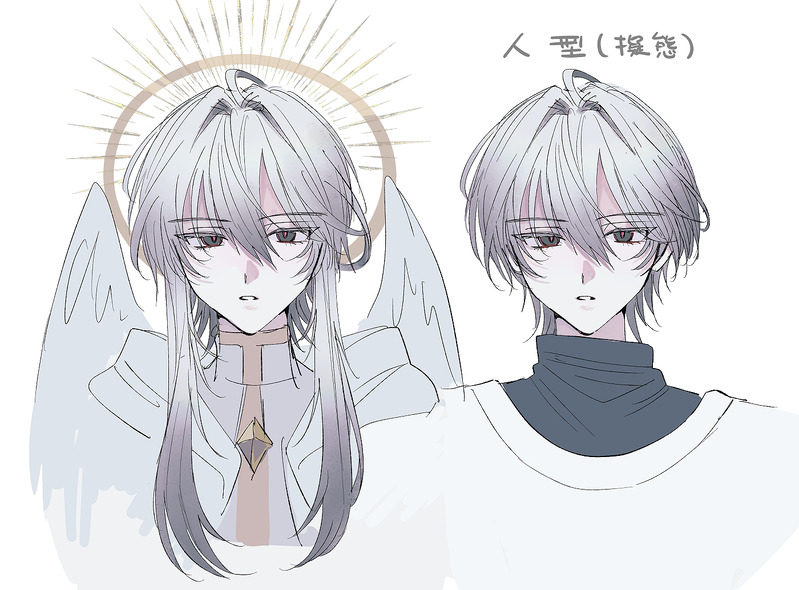 「死を司る天使が死にかけの人間に恋をしてしまう話」を描きたくてキャラデザ練っている途中の絵です