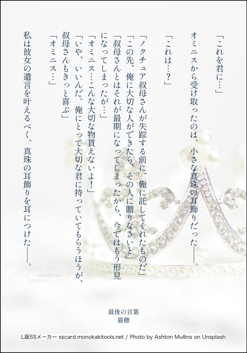 猫穂…🐈⬛☆quiet followPAST🐚真珠の日 show all(+1 images) Tap to full screen (size:954x1365).Repost is prohibited Let's send reactions! freqpopularsnackothersPayment processing Replies from the creator Follow creator you care about!☆quiet follow 猫穂…🐈⬛PAST闇中/螺旋闇中トリオのなにげない日常。いつも通り、地下聖堂で過ごす三人。セバスチャンがどうやら何かに苛立っているようだ…。『ホグワーツ事件簿』シリーズ化する予定(たぶん) 4 猫穂…🐈⬛PASTセバソロモン/向日葵の日記久しぶりにフェルドクロフトへ戻ったセバスチャンは、本棚の奥で『古い日記』を見つける。そこには、叔父さんの秘めた想いが綴られていた…。 6 猫穂…🐈⬛PAST闇中(転♂♀)/代償『彷徨の時期』のつづき。転入生は、♂♀ どちらでも読めるように書いてあります。セバスチャンから悩みを打ち明けられたオミニスは、その件について調べていくうちに、ある重大な事実を知ってしまう。オミニスは確証を得る為に、転入生を地下聖堂に呼び出すが…。ちょっと、えっちな質疑応答があるので R15⚠️15才以上ですか?(yes/no) 3 猫穂…🐈⬛PAST【腐】セビニス/彷徨の時期最近、同室のセバスチャン・サロウは、何か悩んでいるようだ。オミニスが心配していた矢先、セバスチャンにある悩みを打ち明けられる…。続編に→『代償』があります。R15くらい?ちょっぴりH⚠️15才以上ですか?(yes/no) 2 猫穂…🐈⬛PASTセバ転♀/影絵『キスの日』に書いた、淡い恋心の一コマ。 2 猫穂…🐈⬛DONE【腐】セビニス/Take FiveTake Five をモチーフにして書きました。セバスチャンとオミニスがホグワーツ卒業後、恋人同士。Barでの待ち合わせのワンシーン 🥃🔞18才以上ですか? yes / no 4