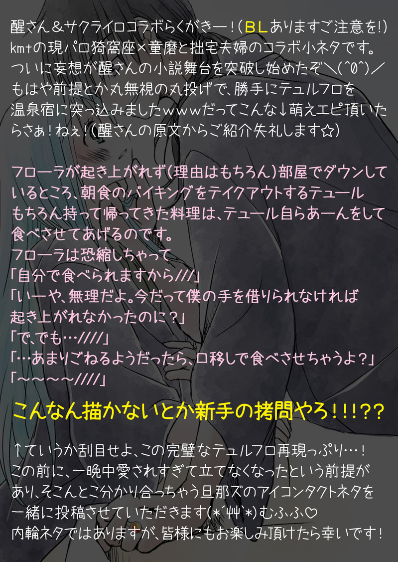醒様が書いて下さっている推しCPコラボ小説(https://www.pixiv.net/novel/series/7900008)の妄想が日夜盛り上がり、ざかざか小ネタを量産する日々です。なんと!続編を書いて下さってるんですよぅ!今度改めてご紹介させて下さい💕