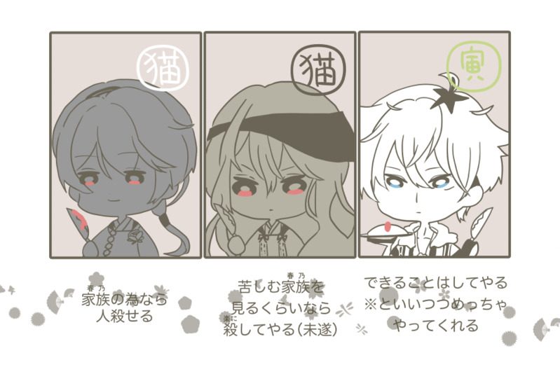 あきら☆quiet followDOODLE🐈🐈⬛🐅えとかれネコ科の皆さんをまとめて描きました。この3人の共通点……家族への愛がわかりやすく深いとか?と考えた結果こうなりました。※十二支の命奪うときに包丁は使ってないですがわかりやすくかけなかった…… Tap to full screen (size:900x590).Repost is prohibited Let's send reactions! freqpopularsnackothersPayment processing Replies from the creator Follow creator you care about!☆quiet follow あきらDOODLE🐉伊吹の全身立ち絵見る度に、伊吹の袴のグラデーションが素敵だなと思います あきらDOODLE🐰今の若者って指2本でハート作れるんですね……!思いついた子すごい! あきらDOODLE🐶クリスタの自動陰影が素晴らしいと聞いたので遊んでみた私ほんっとに久遠の首周り隠すの好きだな あきらDOODLE🐯尊くんの生首消失事件、本当に面白くて笑っちゃった身長考察材料の公式供給(違う)グロくはないが一応生首&誰のかわからない腕があるのでワンクッション あきらDOODLE🐯まだ2/28の27時だからセーフ(※アウトです) あきらDOODLE🐯&🐰干支かれ4周年おめでとうございます!酔っ払い尊くんがつむぎ捕まえてウザ絡みしながらうさぎの耳ーとかやってるの描きました 2