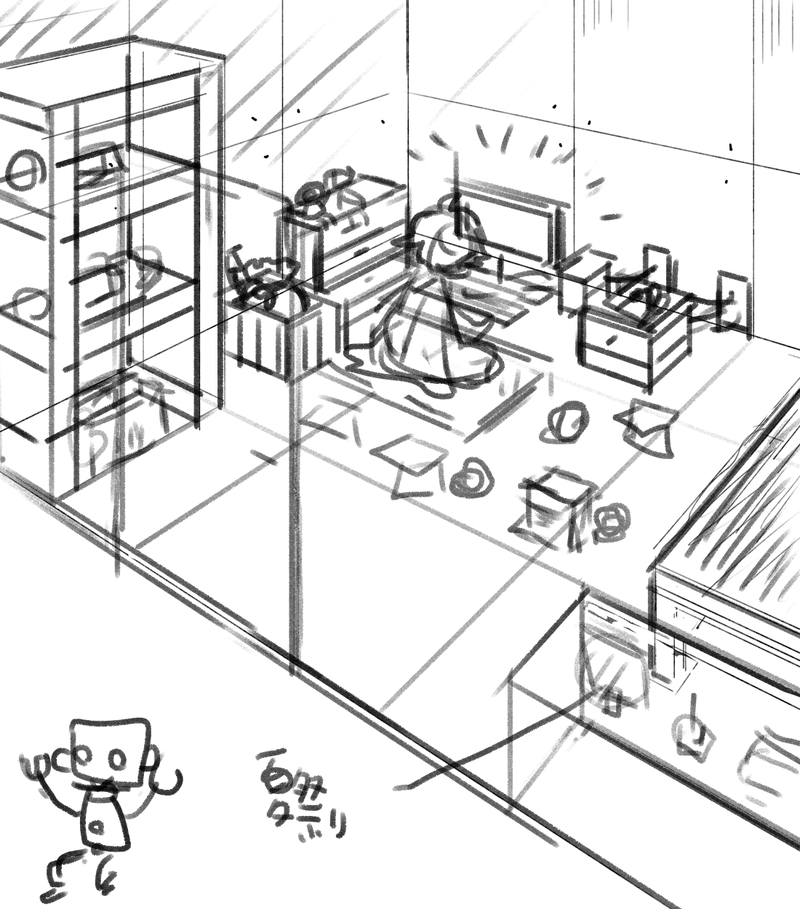 一通り説明していただいてから、じゃあ次男の部屋を試しに描いてみようぜぇ・・・てことになって描いたんだけど棚は壁を突き抜けるわタンスはひっくり返るわ大変でしたね。。。