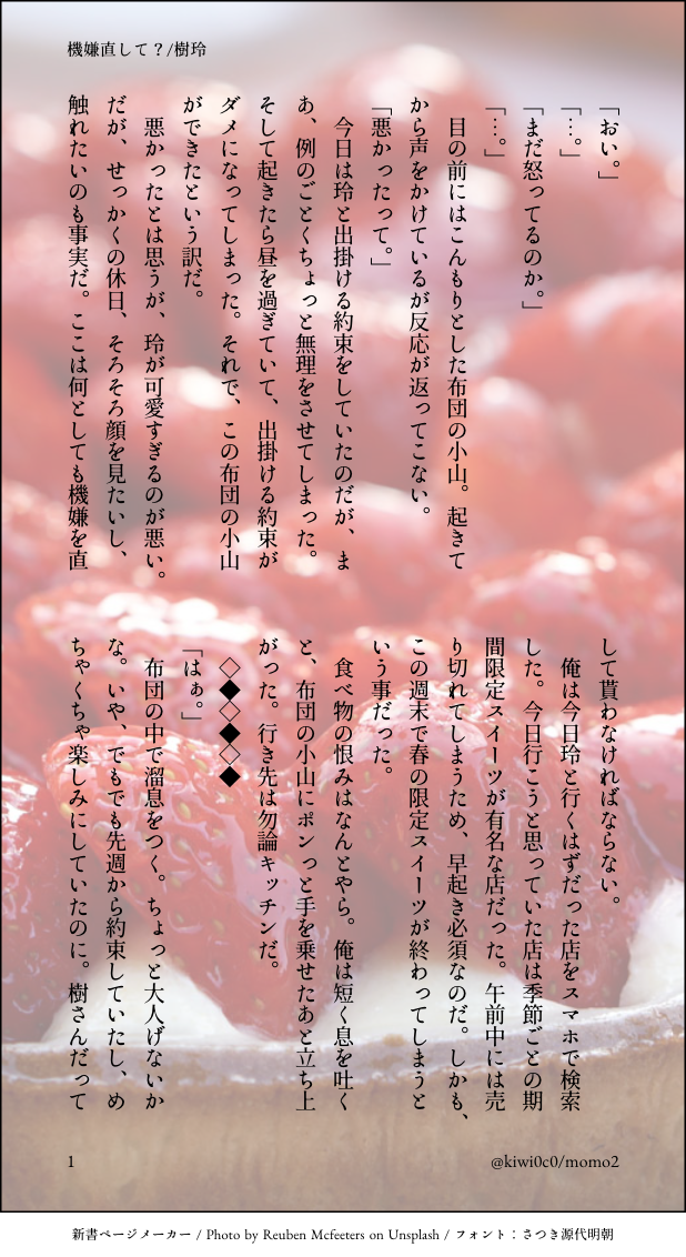 momo☆quiet followDONE拗ねてる玲ちゃんと期限を直してほしい樹さん。 #スタマイ stamae show all(+2 images) Tap to full screen (size:618x1132).Repost is prohibited Let's send reactions! freqpopularsnackothersPayment processing Replies from the creator Follow creator you care about!☆quiet follow momoREHABILI楽紡の日なので書かずにいられず書きました。楽紡にはいつもラブラブしていて欲しいです。楽紡に幸あれ~ 3 momoDONE美容院に行ったばかりの玲ちゃんの髪を無意識に何度も触れちゃう耀さんがいたら良いなと思って書いたお話。 4 momoDONE神楽さんbirthdayに向けて書いたお話。お付き合いしていて、お互いを名前で呼び合っています。 6 momoDONEtwst♦️×女監督生初書きなので解釈違いあるな、たぶん。ケイくんのキャラがまだ掴めていないのに、書きたくなったので書いてしまいました。 4 momoDONE蒼玲ちゃん。蒼生さんBirthdayに書いたもの。 3 momoDONE清玲ちゃん。清志さんのbirthdayに書いたもの。 3 related works saya_starmoonDOODLEお試しぽいぽい。司玲ちゃん。#スタマイ jun_horai0111swDONE初書き宏玲初デート(仮)の一幕とでも思って頂ければ|*・ω・) 2 jun_horai0111swDONEフォロワーさんとの企画で、「春」と「ほんわか」のテーマで書いた蒼玲ちゃんです❤素敵なタイトルをフォロワーさんに考えてもらいました~(∩˘ω˘∩ )♡ 4 小夜の倉庫DONE「恋は人を愚かにする」(誠玲)/2018.1.21誠玲も増やしたい……。 6 うめ@眠いPASTお試しで過去絵#スタマイ #宮瀬豪 小夜の倉庫DONE「白に包まれ」(宮玲)/2018.2.19本編未完結の時期に書いたものなので、しんどい感じになっています。 4 カヤコDONEstmyイメージお題企画よりお借りしたお題で♡耀玲×2、関玲、渡玲の4話 6 雨音 鈴DONE桧山さん🎉お誕生日おめでとう!!ギリギリ間に合った~ペン入れはアナログでやってみました。いつも桧山さんの言葉に励まされます。強さとは、温かさであり、優しさ。これからも桧山さんを応援していきたいなぁ。 小夜の倉庫DONE「Marking」(潔玲)/2018.3.2プライベートでの潔くんの嫉妬台詞があまりにエモかったので。 5