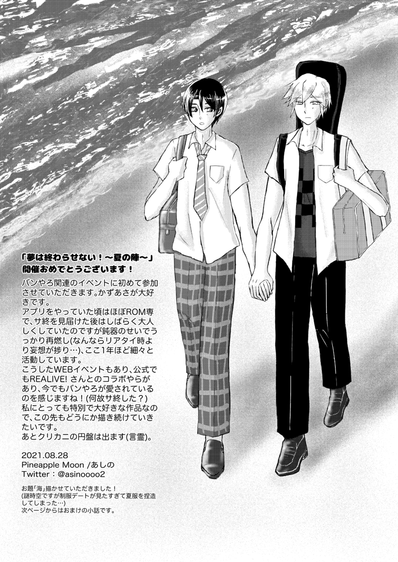 あしの☆quiet followPAST2021年のWEBオンリー「夢は終わらせない!〜夏の陣〜」にて展示させていただいたペーパー(概念)と漫画です。お題「夏」で描かせていただきました。 #かずあさ countlessNumber show all(+3 images) Tap to full screen (size:4961x7016).Repost is prohibited Let's send reactions! freqpopularsnackothersPayment processing Replies from the creator Follow creator you care about!☆quiet follow あしのDONEお題ガチャ「しあわせなふたりのガチャ」よりhttps://odaibako.net/gacha/6074※かずあさ 3 あしのDONEお題ガチャ「しあわせなふたりのガチャ」よりhttps://odaibako.net/gacha/6074※かずあさ あしのPASTここ1年で描いたもののまとめです。(CPはかずあさのみ)かずあさに幸あれ……。 22 あしのPAST2021年のWEBオンリー「夢は終わらせない!〜夏の陣〜」にて展示させていただいたペーパー(概念)と漫画です。お題「夏」で描かせていただきました。 4 あしのMOURNING2020年にかずあさに再燃して最初にpixivにアップした二次創作です。文章が拙いどころではないのですが、自分のフェアエプ観とかずあさ観が詰まってて思い入れはあります……。 3862 あしのDOODLE9月9日が温泉の日と知り……※かずあさ related works あしのPAST2021年のWEBオンリー「夢は終わらせない!〜夏の陣〜」にて展示させていただいたペーパー(概念)と漫画です。お題「夏」で描かせていただきました。 4 あしのMOURNING2020年にかずあさに再燃して最初にpixivにアップした二次創作です。文章が拙いどころではないのですが、自分のフェアエプ観とかずあさ観が詰まってて思い入れはあります……。 3862 あしのPASTここ1年で描いたもののまとめです。(CPはかずあさのみ)かずあさに幸あれ……。 22