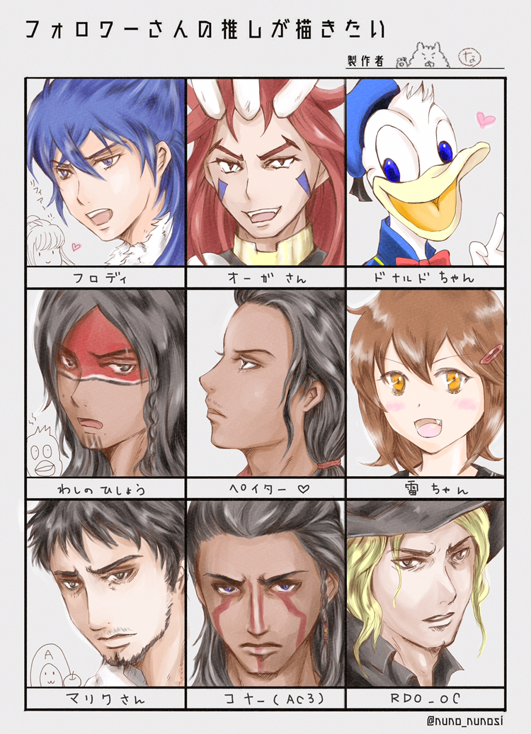 黄金魂のフロディ、GDBのオーガ、ドナルドちゃん、RDR2の鷲の飛翔とペイター、艦これの雷、アサクリのマリク、アサクリ3のコナー、オリキャラです。
