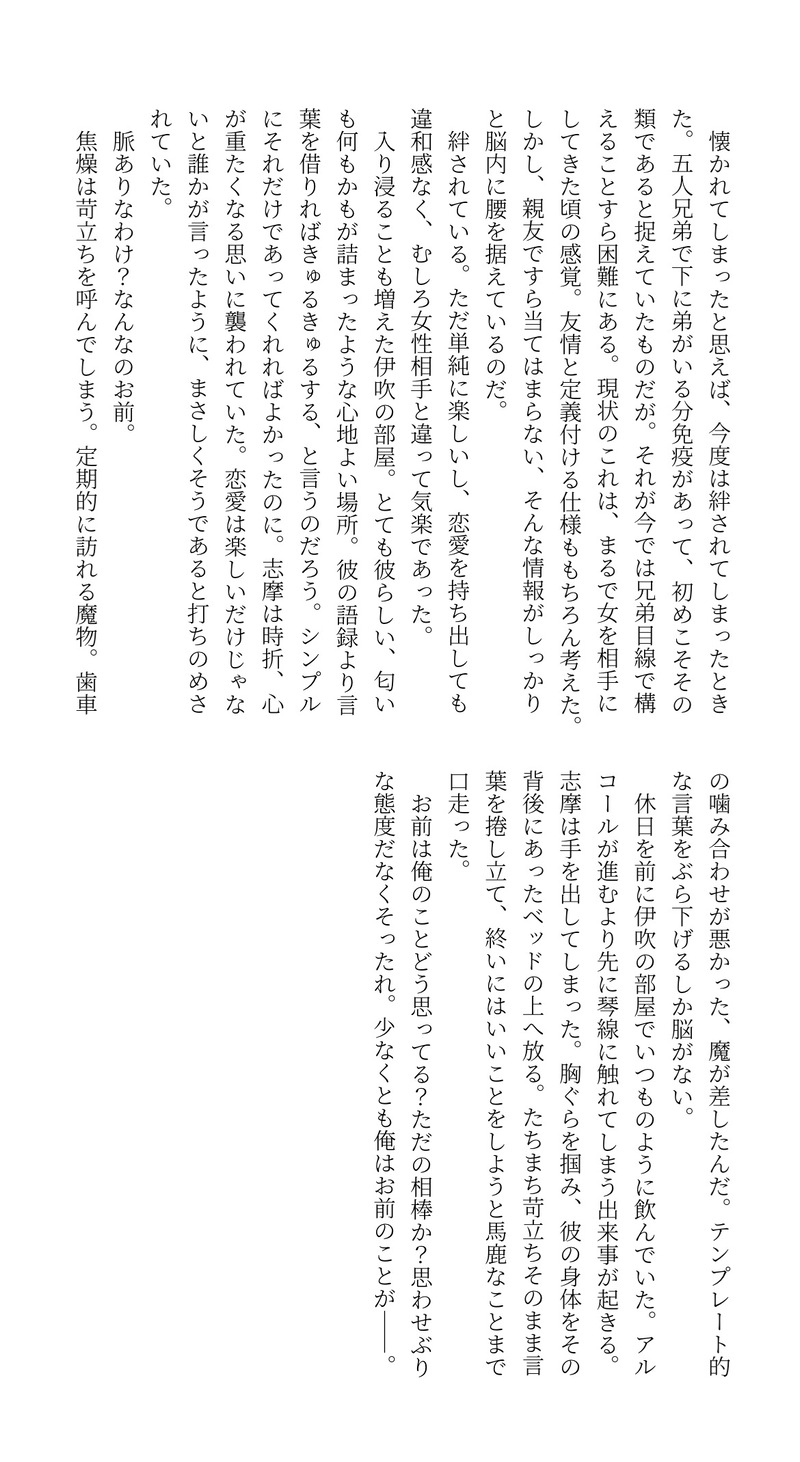 起きたら伊吹の家で、開いた窓からゆるく風が吹き込んでて、昨晩の酔いなんて1ミリも残っててくれなくて……みたいなイメージだった。作った時は朝って澄んでるなとよく思ってて、多分だからできた歌。味噌汁置いて少し間を空けてから切り出すように後半が呟かれてる気がする/伊吹藍は酔った勢い(「だけじゃないけど」)でそうなった翌朝、早く起きて味噌汁作ってくれる男だと思う。