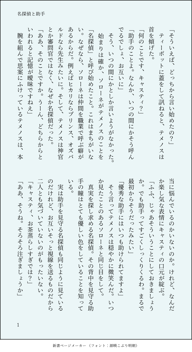 もふもふ☆quiet followDONE「ソローネがテメノスに対して「助手」を買って出ることについて、他の仲間はどう見ているのか?」リクエストありがとうございました〜!口には出さずに二人とも楽しそうだなと眺めてる感じでしょうか……。 show all(+1 images) Tap to full screen (size:618x1132).Repost is prohibited Let's send reactions! freqpopularsnackothersPayment processing Replies from the creator Follow creator you care about!☆quiet follow もふもふDOODLE久しぶりに再会した二人が宿屋の一室で繰り広げる、するしないの攻防戦。直接的な表現はないけど話題がずっとセンシティブ。あと甘い。 9 もふもふDOODLEコルセットの着け方を教えるソローネ暑すぎるとこういうネタしか思いつかなくなる 3 もふもふDONE「普段と違う服や髪型したソローネと、内心ドキドキしてるテメノス」リクエストありがとうございます!ク国の祭りは適当です。もっとこう少女漫画っぽくと思いながら弊大陸のテメノスさんだとこれぐらいの動揺になりました。 3 もふもふDONE「仲間の手によってキャスティがおめかしする話」リクエストありがとうございます!ネタに振り切って書いております。書くの楽しかったです!キャスティ好きで踊子ジョブが好きじゃない人はいないんじゃないでしょうか。 5 もふもふDONE「普通の人から見たテメノスとソローネのやりとり」リクエストありがとうございます!勝手にカプ風味にしてしまいましたが大丈夫でしたでしょうか。違う意味で目立つ二人が並んでるのを見たらフレチャ村民は驚きそうですよね……。 4 もふもふDONE「キャスティに贈り物をしたくて頭を悩ませるソローネ」リクエストありがとうございますー!意図するところと絶対に違う気がするんですが、このラストしか思いつきませんでした。 4 recommended works スピカDONE #ルナミ めっちゃ自分絵…タトゥーと顔の傷、どっちも入る構図考えるの好き。 challlllkDOODLE四回。女上好累还是年轻人体力好(?总的来说是作者本人压力释放产物(? low_IQ_0709DOODLE........다 주의 7 ○みつくDONE偶像梦幻祭2 是HiMERU和天城燐音的校园pa,有蜂、二皮脸提及。连亲亲都没有所以就当是无差,但我是框公请尊重orz。带推跑路但分手饭还是写完了,我是驴。玲明追忆前的产物,刚写完一个月就给我出追忆?行,就当我遇上你万事不顺遂,码成电子版又是一年,总之拉完了。(哈哈当时许愿希望追忆别出这么快,最起码把我露水仙写完,但是他出了,hekk你在玲明的时候就该死了)分手炮晚点打,写完就痿的老毛病罢了。 8588 myuuuii23DOODLEsnbn log❹ 15 radonDOODLE絵描けない寝てしまう、、ほとばしる落書き欲 __myanami_CoCSPOILERさらば肉よ部屋素材遅れててすいません。そういえばこういうのもつきます。でてくる神格のネタバレ有なので注意 5 hitori_054DOODLE⚠️微リョナ⚠️password▶︎界隈数字、有名数字 5 琴の落書き帳PASTすおさく🫖🌸過去のイラスト集password←18↑(yes/no) 3