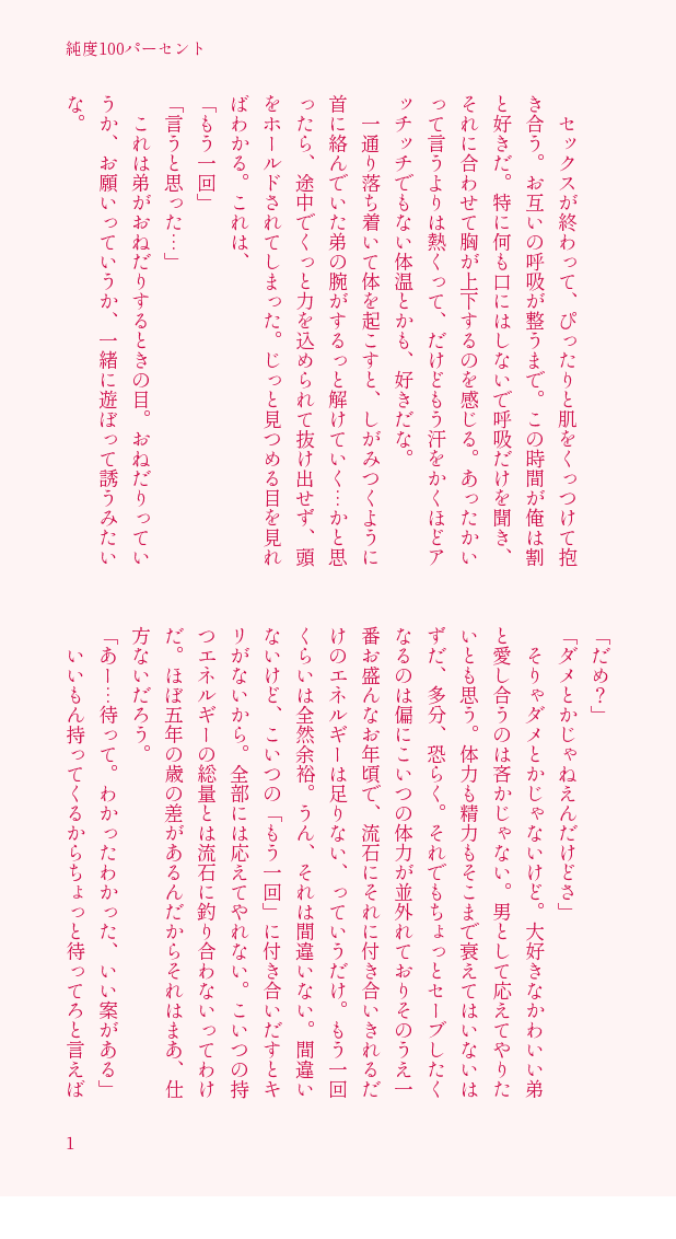 na87113399☆quiet followDOODLE玩具断固拒否の弟の話。なんにもしてないけどそういう話だし事後です。誕生日プレゼントたくさんありがとうございました記念?12.24追記 誤字を発見したので差し替えました!失礼致しました🙏 #燐一 only show all(+3 images) Tap to full screen (size:618x1132).Repost is prohibited Let's send reactions! freqpopularsnackothersPayment processing Replies from the creator Follow creator you care about!☆quiet follow na87113399PROGRESS故郷でなんか変な実を食べてしまい感度が高くなってしまう弟の話が書きたい 途中です一応パスつけたけど現段階ではまだしてないですpass→18↑?yes/no 1224 na87113399DOODLE自堕落な生活をしてるように見えて体力も筋肉も強さも全く衰えてない兄さんが好きだ(って弟も言ってました) 3 na87113399PROGRESS(略)お嫁さんになる話6話初夜編https://www.pixiv.net/novel/show.php?id=14072859↑プロローグから3話までは支部に、4、5話はポイピク内にあります 5447 na87113399DOODLE🔞燐一 2 na87113399MOURNING燐一した翌朝のお腹撫で(絶対どっかにアップしたと思うんだけどどこにも見当たらないのでぽい……)(どこに消えたんだ……?) 4 na87113399MOURNING(燐一)以前書いた両片想い故郷ifのつづきを発掘したので少し加筆修正しつつ供養です 5 related works YakuMOKiyoRDOODLEたぶんキス? na87113399DOODLE🔞再掲。ショタ化兄×弟の燐一 6 且🎲♠️DONE※ちくトレ?要素※天城村の捏造モブと父パス18↑?y/n 2 hoshi_c77PROGRESS燐一/12月の原稿進捗あとは調整とセリフとか 2 路遥知不知INFO「燐一」私人所有物 你们不吃饭吗DOODLE 4 har1osanDOODLE fox0207MOURNING燐一立ちバック、束縛注意 りつ。MOURNING胸糞悪い燐一小説です。結構前に書いて途中で辞めてます。燕の習性を調べていた時に、「親がいなくなった小鳥を勝手に自分の子にする」や「自分の子ではない小鳥を殺めることがある」というのを見た時に思いついた内容です。⚠️故郷に帰って、燐音くんが君主になった世界線です。燐音くんとモブ女の間に赤ちゃんいます。一彩の自我を強くして拗らせてます⚠️ 3543 recommended works owo39857620DONE最冷一天 hoshi_c77PROGRESS構図を考え中の燐一/見開きのつもり右ページ→風呂上がり燐音&寝てる(フリ)弟くんをちょっと描くと分かりやすいですかね。わからんかわいい弟には恋をさせよ DR2023の原稿※気まぐれで載せたり消したりします meuonce_daxijiDOODLE wnbyddbDONE两个版本 2 hoshi_c77PROGRESSFGOパロな燐一の進捗絵の中に簡単な説明を入れるか考え中 tozo32DONE今日は僕が頑張るよ!と意気込んだものの入れただけで動けなくなっちゃった妹※どっちも仕事のタイミングで剃ってる あめもDONE11/23で描いたものの続き(?)ちゅーしてるところ描きたかった 2 まどか@まろやか庵DONE鴉episodes ZEROKuzuha&Lauren&Sebastian鴉過去編映画化して下さい stone👑😎DOODLE*利奥利3p lu(♂)→hyu←lu(♀)*胸部露出,ok绷 2