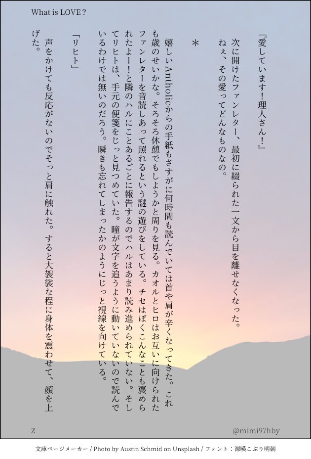 mimi97hby☆quiet followDONEソロ作詞中の灯堂理人。 #Anthos #灯堂理人 ritoKodo show all(+8 images) Tap to full screen (size:630x928).Repost is prohibited Let's send reactions! freqpopularsnackothersPayment processing Replies from the creator Follow creator you care about!☆quiet follow mimi97hbyDONE❤️💙。月がきれいへの今の眞紘なりのアンサー。死んでもいいけど今はまだ。 3 mimi97hbyDONE💜と💛。2022チセ誕。esバレあり。 7 mimi97hbyDONE💚と💜。1:30〜2:25 5 mimi97hbyDONE2021理人誕 6 mimi97hbyDONE2021凌駕誕 7 mimi97hbyDONE❤️と💜。プリンを作る話。 5 related works mimi97hbyDONE💜と❤️。2020理人誕 5 mimi97hbyDONE❤️と💜。Melancholic Rainfall 3 mimi97hbyDONE💛と💜。白髪のおじいちゃんになっても。 7 mimi97hbyDONE💚と💜。2020理人誕 3 mimi97hbyDONE💚💜。理人の髪を乾かしたい凌駕さんの話。 4 mimi97hbyDONE💚💜。Warmth 2 mimi97hbyDONE💜と💙。2020理人誕 3 mimi97hbyDONEソロ作詞中の灯堂理人。 9 mimi97hbyDONE💜と🧡。2020理人誕 3 recommended works mazemazexxxxPAST9-10月分 16 mimi97hbyDONE💜と💛。spectrum 3 mimi97hbyDONE💚💜。Warmth 2 mimi97hbyDONE💜と🧡。2020理人誕 3 mimi97hbyDONE💜と💙。2020理人誕 3 mimi97hbyDONE💜と❤️。2020理人誕 5 mimi97hbyDONE💚と💜。2020理人誕 3 mimi97hbyDONE2021チセ誕 5 mimi97hbyDONE💜と🧡と❤️。おかえりからはじまるエトセトラ 8