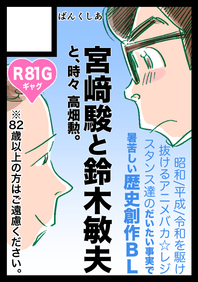 オリジナル/創作BL/歴史創作/憲法9条/憲法21条/絵本/ジブリ/宮崎駿/鈴木敏夫/スタジオジブリ/擬人化/使い捨て布ナプキンエッセイ漫画など。