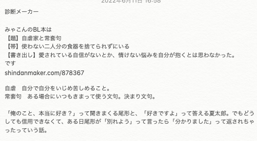 診断メーカーで出てきたやつを書くのに、プロットでも書くか!?と書いたメモ。なんだけど、この後知り合いのめちゃすごプロット見て「ぷ、プロットってそういうものなの!?」と驚いたんだなぁ。わたしのこれはあらすじ、か……?まぁなんでもいいか……設計図……書く……………