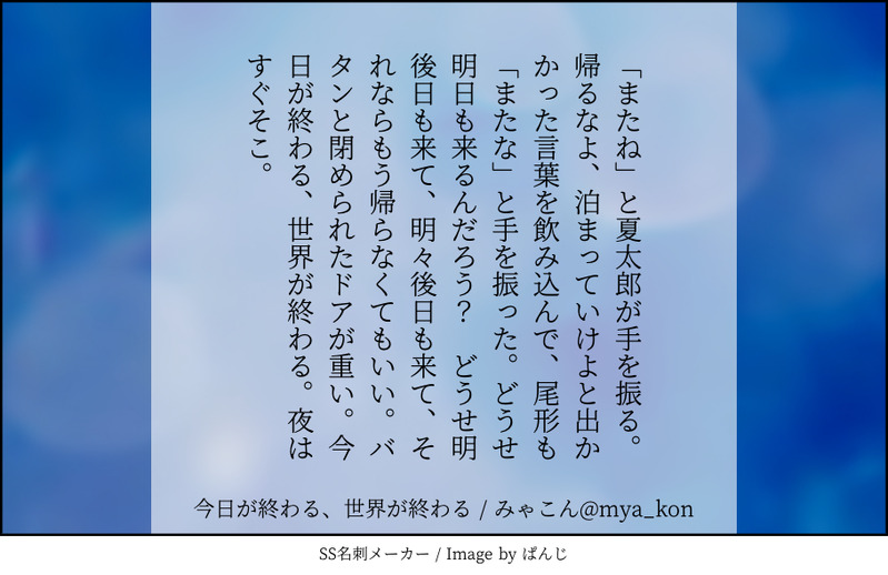 mya_kon☆quiet followDONE診断メーカー( https://shindanmaker.com/a/776155 )を使って書いた140字の夏尾、9/3〜9/30分です!これが141個集まったら本にする予定です☺️ #夏尾 natsuo show all(+27 images) Tap to full screen (size:910x590).Repost is prohibited Let's send reactions! freqpopularsnackothersPayment processing Replies from the creator Follow creator you care about!☆quiet follow mya_konDONE独尊の展示鉄三です!大学生になった三がばったり鉄を見つけて〜みたいな。グレ期に肉体関係があった感じです 2524 mya_konDONE聡狂webオンリーおめでとうございます!いえい!なんやかんやあって平和にお付き合いをしている聡狂です。パスワードは聡実くんのお誕生日を4桁でどうぞ 1573 mya_konMAIKINGかきかけの聡狂……ちゃんと読み直してないので、あれな感じだとは思いますが、一旦……一旦…………!合体はしてないんですけど、なんかぬるすけべあります。♡もちょっと出ます。続きは聡狂webオンリーで公開予定です!頑張る〜〜〜〜 6944 mya_konDONE聡狂ログ本のおまけ的な小話のイラストです。後ろに文庫メーカーで作った小話も置いておきますね。まさか小説の方にイラストが挟めないなんて思わなかったんです……パスワードは向こうと同じです! 5 mya_konDONE聡狂ログ本、ご注文ありがとうございます!おまけ的な聡狂です。ログ本に出てくる妄想ポストが元になっています♡ちなみに挿絵?おまけイラスト?を入れようと描いてたんですけど、小説の方には載せられないことに気づいたので、それはこっちにあります。パスワードはここと同じです!https://poipiku.com/808991/10010413.html 1129 mya_konDONE逆バニー服を着た夏と、それを着せた尾です。ぬるいとはいえすけべなので……18↑? 5752 related works mya_konDONE「吸血鬼が生きる世界には、マッチョが血液を提供するバーがあるのでは?」というフォロワーさんの呟きに反応して、爆発した結果のものです。夏太郎が吸血鬼、尾形がマッチョバー店員やってます 7427 mya_konDOODLE何でしょうね。とりあえず心の赴くまま書いてみましたが、何でしょうね……気が向いたらちゃんと書くんじゃないかな……ノープラン…… 1018 mya_konDONE「そんなつもりはなかったんだけど」っていう感じの夏尾です。事後の雰囲気?匂わせ?なので質問しますが、何もないです。彼氏ヅラしてくる夏ちゃんが書きたかったはずなんですけど、なんか違いますね。まあいっか。そういうわけであなたは18才以上で、高校生ではないですね? 1583 mya_konDONE夏ちゃんのアニカム4期参加確定が嬉しくて、夏尾を書きました!!!!!!おめでとうかんたや!!!!!!!!!!!世界が君の可愛さに気づくぞ!!!!!!!!!!!!!!! 1846 mya_konDONEこれ https://poipiku.com/808991/7974018.html の続きです〜。なんかいろんなもの盛り込んでみましたが、R-18を名乗るにはぬるく……しかし名乗らないといけない……そういう感じです。なのでいつもの質問ですねあなたは18歳以上で、高校生ではないですね? 5147 mya_konDONEどんぐりひろいやさん かんたろおです〜☺️3で終わると言ったな?あれは嘘だ……次で終わります、ちゃんと終わります……可愛い夏尾だよ……😘1→ https://poipiku.com/808991/7900141.html2→ https://poipiku.com/808991/7922282.html 4270 mya_konDONEこれは……いつか本になるから……と自分に言い聞かせて書いた夏尾……フォロワーが描いた夏尾見て書いた……わああああああああってなりながら……書いた……いつか本になるから……原稿といっても間違いではない…………… 2759 mya_konMAIKINGラジオ体操で繋がる夏尾です。書きかけ?もう少し……先まで続けたかったけど、なんかもう、ちょっと一回投げておきます……☺️多分そのうち続き書きます……多分……いやでも、これはこれでまた書きたいネタがいくつかあるので……ネタ?シーン?まあいいや 3191 mya_konDOODLE夏の誕生日である8/1の翌日はバニーの日だ!ってことで混ぜました。なんだろうこれ?よくわからないので、ノーチェックのまま投げます。この夏尾は手を繋ぐのにキャーキャーしてた夏尾です。年齢制限……?となっているので、とりあえずいつもの質問しておきますね。明日読み直して大丈夫そうだったら質問外すかも……?あなたは18才以上で、高校生ではないですね? 2092 recommended works komachiyotaDOODLE外套被った尾形はかわいさ神なので間違ってない @huzzzta0DOODLEイヤフォン勇尾のつづきpass 18↑?(yes/no) 2 wooo_0807DONEマシュマロお題から尿◯責の現パロ勇尾です🔞※尾が普段すぐ達してしまって体力がなくなるので、せきとめているという設定の上読んでください🙇♀️全然尿道責めしてないね⁉️すみません、またリベンジします✊パスワード 20↑? yes/no 2 111miyukiDONE勇尾Webオンリー用にネップリ登録していたものです。終了しました。プリントしてくれた方、ありがとうございました。あとあまりの背景処理のダサさに(笑)事前に大騒ぎした際なぐさめてくださったフォロワさんも……ありがとうございました!画像のように切り抜いて小さいシールにすると可愛いような気がします(*´▽`*)自画自賛。 3 simoneeeDOODLE勇尾