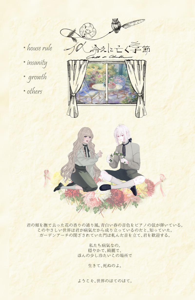 anko_gprt☆quiet followSPOILERクトゥルフ神話TRPG『花冷えに亡く季節』(作:春眠様)KP:あんこPLHO記 / クレア・ウィスタリア:卯月さんHO花 / ユウリ:つきみさん Tap to full screen (size:1885x2901).Repost is prohibited Let's send reactions! freqpopularsnackothersPayment processing Replies from the creator Follow creator you care about!☆quiet follow anko_gprtSPOILERクトゥルフ神話TRPG『花冷えに亡く季節』(作:春眠様)KP:あんこPLHO記 / クレア・ウィスタリア:卯月さんHO花 / ユウリ:つきみさん anko_gprtSPOILERマーダーミステリー『そらとくじらのエンゲ』(作:イバラユーギ×ひろゆ~プロジェクト様)GM:もるさんPL:るこさん、夜明さん、はんぺんさん、あんこ anko_gprtSPOILER新クトゥルフ神話TRPG『冒涜都市Z〜深碧の魔境〜』(作:ディズム様)KP:あんこPLNyke・Hanser:浅葱さんAlbert・Diggory:うずらさんRaymond・Riddle:カロさん anko_gprtSPOILERクトゥルフ神話TRPG『四季送り』(作:しろは様)KP:あんこPL晴日 藤香:るこさん白鷺 朱華:夜明さん紅葉:はんぺんさん千冬:もるさん anko_gprtSPOILERクトゥルフ神話TRPG『梅に鶯、白百合に烏』(作:ひちころり様)KP:あんこPL灰土 雨花 / るこさん鈴草 若菜 / はこさん anko_gprtSPOILERクトゥルフ神話TRPG『Toy! Toy! Toy! Show time!』(作:たぬたぬ堂様)KP:はんぺんさんPLリュシアン・ルー / もるさんイリス・ロネ / あんこ来栖 恋 / るこさんウルル・テラノ / いなばさん recommended works nijyu7_mDOODLE異空マホボロボロマシマシらくがき 2 onuri_bobDOODLE고죠게토 뱀수인au 그림모음 7 おやぶDOODLE幼少期 2 OkraDDOODLE🕶️ 2 葉月栞DONETwitterに載せたものの差分 NisanumakoDONEあトまつげんみ⭕️ 立ち絵差分まとめただけパスは4 5 417nilPROGRESS2/9ユキモモR18新刊サンプル一部(脱稿してません)ページ繋がってないですよろしければ部数アンケートご協力ください( https://forms.gle/w7m8cfWVX6DG5J8U8 ) 8 DS_JennDONE¿Por qué no? 🤨 卓の記録たちDOODLE⚠️ネタバレ終夏 げんみ❌ 174