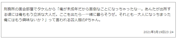 お題箱まとめ本用にかんたんに挿絵(?)を描いています これはタケルくんに手を出したので刑務所に入れられたPの面会に来てくれるタケルくんのやつです