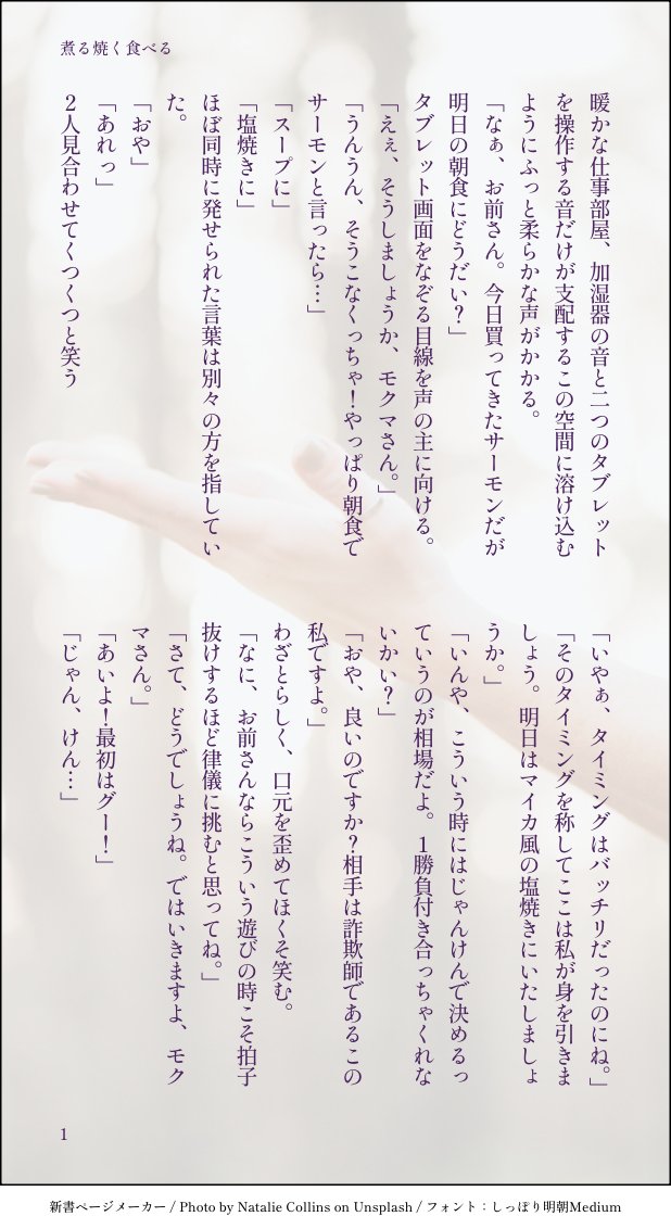RenBu☆quiet followPASTモクチェズ版ワンドロワンライに投稿した作品お題「拳」をお借りしました。じゃんけん一本勝負をする2人のお話です Tap to full screen (size:618x1132).Repost is prohibited Let's send reactions! freqpopularsnackothersPayment processing Replies from the creator Follow creator you care about!☆quiet follow RenBuPASTモクチェズワンドロワンライお題「骨」で書いた物です背中ごしに相手の背骨とかに触れるのヘキなんですよ事後です 2 RenBuPASTモクチェズ版ワンドロワンライに投稿した作品お題「拳」をお借りしました。じゃんけん一本勝負をする2人のお話です RenBuDONE[目覚めの1杯]モクチェズワンドロお題「怠惰」をお借りして書きました。昨夜お楽しみしすぎたチェのお話です。甘酒の豆乳割り、実際に飲んでみると結構甘々ですが疲れた夜には優しく身体へ染み渡ります。 2 RenBuPAST「月と秋夜」モクチェズss2作目でした秋頃に書いた作品で、寝冷えしてしまったチェがおじさんの体温で暖を取るお話です 6 RenBuDONEワンドロ100回目に参加させていただいて書きました。お題はフリー枠なのかな?と「幸福」がテーマですツイの画像見づらい人向け 1024 RenBuDONEモクチェズss「初夢バニー?」これはモさんの夢なのか現実なのか、新年なので景気よく、都合よく、チェにバニーちゃんになってもらいました。ちょっとあほえろなのでワンクッション 2 recommended works rntnxinranDOODLE茶屋的炭子 26 yuito_dream27DONE #夜の819プラス #夜のHQプラス スナ / オサム / サクサ / コモリ【痴漢された🌸を消毒する話。②】※♡喘ぎ、濁点表現あり未成年閲覧NG🙅♀成人済みですか?▶( yes / no ) 4 yuito_dream27DONE #夜の819プラス #夜のHQプラス クロオ / イワイズミ / サワムラ / アズマネ【高身長女子と819男子。】※♡喘ぎ、濁点表現あり未成年閲覧NG🙅♀成人済みですか?▶( yes / no ) 4 97eFlSPOILERエアダンげんみ❌自陣⭕ねこまさんが描いてくれたHO3のクリファン差分みてPASS:yes 2 かすてらDOODLE映画を振り返ってしみじみと思ったこと 2 森野クマ3PROGRESS今日の進歩477髪の部分少し変えてみた いちろくDONE藤乃ちゃんお誕生日おめでとうってことで描いた大福食べるちみ藤乃ちゃん(うちかのちゃん絵) tatewaki_yamanoDOODLE TaiZDOODLEJack x Norton!!!: dubconpass: y/n 2