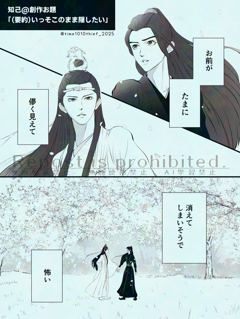 も²@time1010thief☆quiet followDONE知己で創作お題消化!ちょっと早いけど桜に攫われそうな感じも混ぜてみました!(一応ハンゴンジュン視点だけどお互い思ってたら良いなぁなどと…) #cql #魏嬰 weiYing #魏無羨 WeiWuXian #藍湛 indigoBlueWaterlogging #藍忘機 blueForgottenMachine #含光君 containingLight show all(+1 images) Tap to full screen (size:1000x1333).Repost is prohibited Let's send reactions! freqpopularsnackothersPayment processing Replies from the creator Follow creator you care about!☆quiet follow も²@time1010thiefDOODLEFF様のポストから🐱手遊び知己👐 も²@time1010thiefDONEひとコマ漫画リク(表垢)3本纏め(知己超え3本は🔑垢) 3 も²@time1010thiefDONE祝!陳情令6周年🙌 も²@time1010thiefMOURNING☔気をつけよ も²@time1010thiefMOURNING⚠️50話以降、雲深不知処で暮らす知己設定🔑に載せてた漫画の別Ver. 共に暮らすうちに二人の間で暗号とか合言葉的なやつが交わされてたら良いななどと何を意味するかは知己しか知らない🤫 (※某海外ドラマの台詞より着想) 2 も²@time1010thiefMOURNING魏婴在哪? related works すずろうDONE忘羡 Sayaxx0217DONEようやく2人かけたー lee5170abPAST酔っぱらんじゃんシリーズ。 7 ニノ式啓水DOODLE赤い服着て、組体操しているだけの知己です。知己です。※ナレーションセリフは、シギ氏作のフリー素材ですw 2 落梅(おちうめ)PAST【阿苑をあやす含光君】【魏無羨の思い出が優しすぎて罰が足りない藍忘機】Twitterに流したやつで、続き描きたい気持ちだけがある…という。 4 しばた三歳DONE新婚忘羨ちょいすけべ。原作終了後、公に道侶となった2人と藍家のようすを妄想。魏嬰のイキの良さと藍湛の可愛らしさを表現したかった。初投稿どきどきしています。・アニメ/原作/陳情令の順で履修済・ハピエン至上主義・忘羨が好きすぎて爆発しそうになり、久しぶりに二次創作を書きました。どうぞ優しくして下さい… 18 はるもん🌸MOURNING「冗談、冗談だよな?」魏無羨が焦りに焦るその姿、これは演技ではなかった。魏無羨の魂の記憶が10代中盤、つまり藍忘機と座学を共に過ごした時期まで戻っているのである。 14953 ニノ式啓水PAST【再掲】CQLベースの作品です。ちなみに、白菜セーターはフレからのリクエストで、実在するセーターですww 13 ありすDONEこういうバックハグキスがとても好物です。構図はフリー素材をお借りしました。キスマと歯型を描くのが楽しかったです。#魔道祖師 #mdzs #忘羨 #藍忘機 #魏無羨