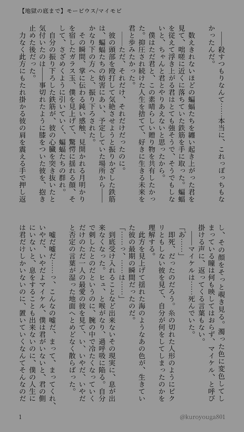 kuroyouga801☆quiet followMOURNINGもし映画ラストでマイロが誤ってマイケルを殺してしまったら…なif話。マイモビの心中小説です。死ネタで暗いですが…まあ私はハピエン厨なので以下略。マイケル殺した後に二人分の毒見つけたらマイロめちゃくちゃキッ…ツイよな…と思ったら書かずにはいられなかった(鬼か)よろしかったらどうぞ😌 show all(+3 images) Tap to full screen (size:2472x4368).Repost is prohibited Let's send reactions! freqpopularsnackothersPayment processing Replies from the creator Follow creator you care about!☆quiet follow kuroyouga801DONEジュリアレジュリですがジュリアレよりかもしれません。もしジュリアンが寂しがりやなだけの天才だったら。飛んでくアテナ見てかっこいい~!と叫んだ無邪気さが本質だったら。のIFで平和時空ジュリアレジュリです。(?)すべてが幻覚捏造。推し二人にイチャイチャくっついてほしかっただけ。キスしてるのでちょとだけエロぽくなる。だいぶキャラ崩壊してますご注意を!パスワードはr15↑y/n 8 kuroyouga801DONE六年ぶりに逢ったお兄ちゃんがもし結婚してたら?で昼ドラ展開のギジュンギソクSS書きました。弟の執着心や兄のゲスみ、それと二人がどう足掻いてもしっかり裏社会の人間だったら興奮するなって考えてたら止まりませんでした。こういうダークなのも好きです。モブ女さんはほんとごめん…どっかで幸せなってこのイカれ兄弟のいない場所で。※兄弟二人とも倫理観もなく最低野郎です。ご注意を!pass 19↑y/n 9 kuroyouga801DONEギジュンギソク前提でグムソンギソクです。もしギソクを殺さず監禁していたら?のIF話です。読みたいとこだけ書きました。レイプ描写有り。グムソンくんがずっとギソクさんのこと愛憎交えて片想いしてたら――と暴走しました。兄さんは兄さんしてます🥹🫶兄弟と忠犬ヘボムくんが大好きなので無理やり全員出しました、楽しかった…ギソクくんエロすぎ……pass 18↑ y/n 5 kuroyouga801DONE罪悪感で押し潰されそうなボブをエレーナとボルツファミリーが引き留めるお話です。優しい世界が見たくて書きました。エレボブエレとチームの面々はもうずっと一緒にいればいいよ… 8 kuroyouga801DONEエレボブエレ。エレボブがコーヒーとココア飲みながらメンタルケアしてるお話。ボブの過去捏造、性的虐待描写あるのでご注意。弊エレーナはスパダリです。もうずっと離れないで幸せでいてほしい…。pass 18↑?(yes/no) 9 kuroyouga801MOURNING性転換AUのセルディマです。姉×妹。ニコライによるディマちゃんへの軽い性虐待描写や、夫のジジイからのレイプ未遂描写ありますご注意下さい!好きすぎる…身勝手姉貴と振り回される健気な妹ちゃん…楽しかった…誰かに刺さるといいなぁ…😌🫂pass 15↑ y/n 12 recommended works 恹恹面DOODLEmob注意⚠️p2大概是醒酒後^^ 2 kuroyouga801DONE体調崩して倒れたマイケルとそれに感情ぐちゃっとされるマイ口のマイモビちゃんです。時間軸は映画直前、コウモリの研究を始めた頃のイメージで書きました。病に蝕まれながらお互いを一番に想いすれ違う二人はほんと、泣けますね…。ちゃんと会話して、ちゃんと幸せになって欲しいです……。 6 kuroyouga801DONE寒い日のマイモビちゃんです❄️あまりにも寒いので、初めての雪遊びをするマイモビちゃんのお話書きました☃️ 映画後幸せアースです☺️💗 よろしければどうぞ~~😊🙌 7 kuroyouga801DONE映画前のマイモビちゃんです。ラボでの話。マイロのクソデカに慣れすぎてるマイケルが、微笑みひとつ発言ひとつでマイロを翻弄するお話です。何でもない二人の日常を抽出したくて書きました。よくわからない話ですがどうぞ。マイモビちゃん幸せになって…… 8 zo_tuiteDOODLE今週のムルソー kuroyouga801DONEまんまる大きな満月見上げてイチャイチャするマイモビちゃんです。クソデカぶつけあって永遠に幸せでいるといいよ…………。 2 kuroyouga801DONE地獄のすれ違いをし続けるマイモビちゃんです。あのラボで喧嘩する前に、二人でちゃんと話し合っていれば──読んだ後にそんな気持ちになれるお話です。「僕を忘れないで欲しい」と強く願うマイロの執着が、マイロに逢いたいと願うマイケルを生かし続ける呪いになってしまう……なんてあまりにも素敵だと思って書きました。その結果永遠に逢えないままのマイモビちゃんは、悲劇的で、とても美しいです……(病んでないです) 4 いさなDOODLE halluDOODLE26