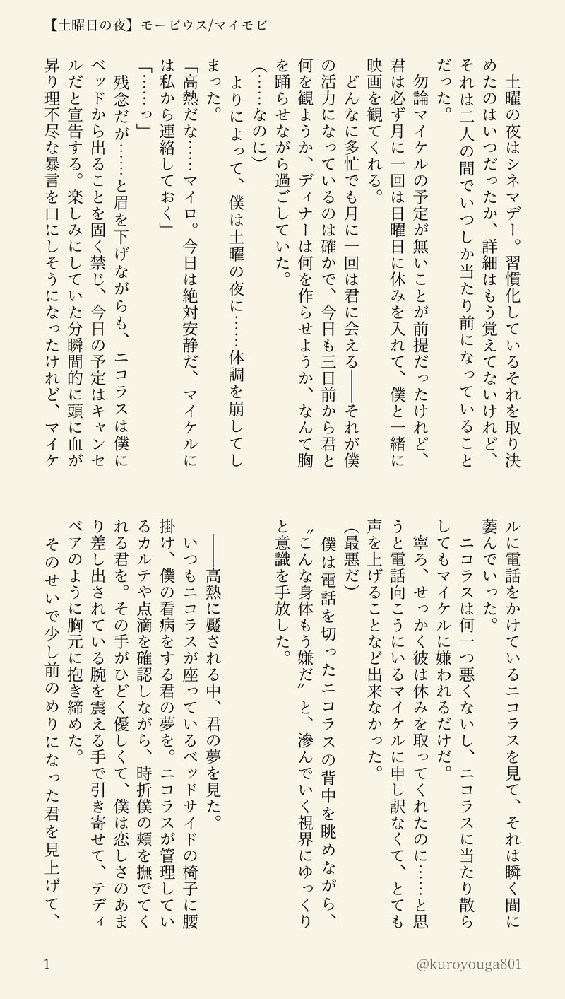 kuroyouga801☆quiet followMOURNING風邪引きマイロのマイモビちゃんです!二人で映画を観たかったのに体調崩してぐずくずになるマイロと、それをよしよししてくれるマイケルの優しい土曜日のお話。私は本当にかわいいマイロが大好きなんだなぁ…と読み返すたびに笑顔になります🥰💕よろしければどうぞ~💖 show all(+2 images) Tap to full screen (size:2472x4368).Repost is prohibited Let's send reactions! freqpopularsnackothersPayment processing Replies from the creator Follow creator you care about!☆quiet follow kuroyouga801DONEジュリアレジュリですがジュリアレよりかもしれません。もしジュリアンが寂しがりやなだけの天才だったら。飛んでくアテナ見てかっこいい~!と叫んだ無邪気さが本質だったら。のIFで平和時空ジュリアレジュリです。(?)すべてが幻覚捏造。推し二人にイチャイチャくっついてほしかっただけ。キスしてるのでちょとだけエロぽくなる。だいぶキャラ崩壊してますご注意を!パスワードはr15↑y/n 8 kuroyouga801DONE六年ぶりに逢ったお兄ちゃんがもし結婚してたら?で昼ドラ展開のギジュンギソクSS書きました。弟の執着心や兄のゲスみ、それと二人がどう足掻いてもしっかり裏社会の人間だったら興奮するなって考えてたら止まりませんでした。こういうダークなのも好きです。モブ女さんはほんとごめん…どっかで幸せなってこのイカれ兄弟のいない場所で。※兄弟二人とも倫理観もなく最低野郎です。ご注意を!pass 19↑y/n 9 kuroyouga801DONEギジュンギソク前提でグムソンギソクです。もしギソクを殺さず監禁していたら?のIF話です。読みたいとこだけ書きました。レイプ描写有り。グムソンくんがずっとギソクさんのこと愛憎交えて片想いしてたら――と暴走しました。兄さんは兄さんしてます🥹🫶兄弟と忠犬ヘボムくんが大好きなので無理やり全員出しました、楽しかった…ギソクくんエロすぎ……pass 18↑ y/n 5 kuroyouga801DONE罪悪感で押し潰されそうなボブをエレーナとボルツファミリーが引き留めるお話です。優しい世界が見たくて書きました。エレボブエレとチームの面々はもうずっと一緒にいればいいよ… 8 kuroyouga801DONEエレボブエレ。エレボブがコーヒーとココア飲みながらメンタルケアしてるお話。ボブの過去捏造、性的虐待描写あるのでご注意。弊エレーナはスパダリです。もうずっと離れないで幸せでいてほしい…。pass 18↑?(yes/no) 9 kuroyouga801MOURNING性転換AUのセルディマです。姉×妹。ニコライによるディマちゃんへの軽い性虐待描写や、夫のジジイからのレイプ未遂描写ありますご注意下さい!好きすぎる…身勝手姉貴と振り回される健気な妹ちゃん…楽しかった…誰かに刺さるといいなぁ…😌🫂pass 15↑ y/n 12 recommended works kuroyouga801DONE体調崩して倒れたマイケルとそれに感情ぐちゃっとされるマイ口のマイモビちゃんです。時間軸は映画直前、コウモリの研究を始めた頃のイメージで書きました。病に蝕まれながらお互いを一番に想いすれ違う二人はほんと、泣けますね…。ちゃんと会話して、ちゃんと幸せになって欲しいです……。 6 kuroyouga801DONE寒い日のマイモビちゃんです❄️あまりにも寒いので、初めての雪遊びをするマイモビちゃんのお話書きました☃️ 映画後幸せアースです☺️💗 よろしければどうぞ~~😊🙌 7 kuroyouga801DONE映画前のマイモビちゃんです。ラボでの話。マイロのクソデカに慣れすぎてるマイケルが、微笑みひとつ発言ひとつでマイロを翻弄するお話です。何でもない二人の日常を抽出したくて書きました。よくわからない話ですがどうぞ。マイモビちゃん幸せになって…… 8 kuroyouga801DONEまんまる大きな満月見上げてイチャイチャするマイモビちゃんです。クソデカぶつけあって永遠に幸せでいるといいよ…………。 2 kuroyouga801DONE地獄のすれ違いをし続けるマイモビちゃんです。あのラボで喧嘩する前に、二人でちゃんと話し合っていれば──読んだ後にそんな気持ちになれるお話です。「僕を忘れないで欲しい」と強く願うマイロの執着が、マイロに逢いたいと願うマイケルを生かし続ける呪いになってしまう……なんてあまりにも素敵だと思って書きました。その結果永遠に逢えないままのマイモビちゃんは、悲劇的で、とても美しいです……(病んでないです) 4 ituki_mikanDOODLEVOID HO1のイメソンイラストだぁぁぁぁぁぁあぁぁ!!!! 2 ONAK_6secDOODLE🎤ムビパンフの関係性のとこ‼️(🐴1️⃣) 2 @keiko_puchi22DONE和装の心海で miyabi__SGDOODLEロック・ハワード 新作餓狼伝説体験版かっこいい