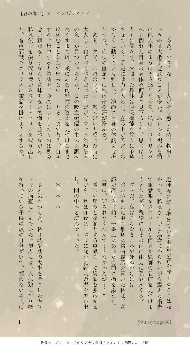 kuroyouga801☆quiet followDONE体調崩して倒れたマイケルとそれに感情ぐちゃっとされるマイ口のマイモビちゃんです。時間軸は映画直前、コウモリの研究を始めた頃のイメージで書きました。病に蝕まれながらお互いを一番に想いすれ違う二人はほんと、泣けますね…。ちゃんと会話して、ちゃんと幸せになって欲しいです……。 #モービウス moebius #マイモビ mymobi show all(+5 images) Tap to full screen (size:618x1132).Repost is prohibited Let's send reactions! freqpopularsnackothersPayment processing Replies from the creator Follow creator you care about!☆quiet follow kuroyouga801DONEジュリアレジュリですがジュリアレよりかもしれません。もしジュリアンが寂しがりやなだけの天才だったら。飛んでくアテナ見てかっこいい~!と叫んだ無邪気さが本質だったら。のIFで平和時空ジュリアレジュリです。(?)すべてが幻覚捏造。推し二人にイチャイチャくっついてほしかっただけ。キスしてるのでちょとだけエロぽくなる。だいぶキャラ崩壊してますご注意を!パスワードはr15↑y/n 8 kuroyouga801DONE六年ぶりに逢ったお兄ちゃんがもし結婚してたら?で昼ドラ展開のギジュンギソクSS書きました。弟の執着心や兄のゲスみ、それと二人がどう足掻いてもしっかり裏社会の人間だったら興奮するなって考えてたら止まりませんでした。こういうダークなのも好きです。モブ女さんはほんとごめん…どっかで幸せなってこのイカれ兄弟のいない場所で。※兄弟二人とも倫理観もなく最低野郎です。ご注意を!pass 19↑y/n 9 kuroyouga801DONEギジュンギソク前提でグムソンギソクです。もしギソクを殺さず監禁していたら?のIF話です。読みたいとこだけ書きました。レイプ描写有り。グムソンくんがずっとギソクさんのこと愛憎交えて片想いしてたら――と暴走しました。兄さんは兄さんしてます🥹🫶兄弟と忠犬ヘボムくんが大好きなので無理やり全員出しました、楽しかった…ギソクくんエロすぎ……pass 18↑ y/n 5 kuroyouga801DONE罪悪感で押し潰されそうなボブをエレーナとボルツファミリーが引き留めるお話です。優しい世界が見たくて書きました。エレボブエレとチームの面々はもうずっと一緒にいればいいよ… 8 kuroyouga801DONEエレボブエレ。エレボブがコーヒーとココア飲みながらメンタルケアしてるお話。ボブの過去捏造、性的虐待描写あるのでご注意。弊エレーナはスパダリです。もうずっと離れないで幸せでいてほしい…。pass 18↑?(yes/no) 9 kuroyouga801MOURNING性転換AUのセルディマです。姉×妹。ニコライによるディマちゃんへの軽い性虐待描写や、夫のジジイからのレイプ未遂描写ありますご注意下さい!好きすぎる…身勝手姉貴と振り回される健気な妹ちゃん…楽しかった…誰かに刺さるといいなぁ…😌🫂pass 15↑ y/n 12 related works kuroyouga801DONEまんまる大きな満月見上げてイチャイチャするマイモビちゃんです。クソデカぶつけあって永遠に幸せでいるといいよ…………。 2 kuroyouga801MOURNING映画前のマイモビちゃんです。あまりにも一途すぎるマイロのクソデカに想いを馳せてたらいつの間にか書いてたやつ…。マイロの矢印がすごいし、無自覚マイケルの矢印もすごいです。映画のラスト想像しながら読むと泣けます(私が)何でふたりぼっちで幸せにならなかったんだマイモビちゃん…っ😭😭😭 3 kuroyouga801DONE一年目の結婚記念日をお祝しようとするマイモビちゃんのお話です。めでたいのに中盤まで喧嘩してるし無駄に長いしマイケルの説明不足(公式)により何だかマイ口可哀想(公式)ですが、ちゃんとハピエンです、よろしければどうぞ! 11 kuroyouga801DONE地獄のすれ違いをし続けるマイモビちゃんです。あのラボで喧嘩する前に、二人でちゃんと話し合っていれば──読んだ後にそんな気持ちになれるお話です。「僕を忘れないで欲しい」と強く願うマイロの執着が、マイロに逢いたいと願うマイケルを生かし続ける呪いになってしまう……なんてあまりにも素敵だと思って書きました。その結果永遠に逢えないままのマイモビちゃんは、悲劇的で、とても美しいです……(病んでないです) 4 kuroyouga801DONE体調崩して倒れたマイケルとそれに感情ぐちゃっとされるマイ口のマイモビちゃんです。時間軸は映画直前、コウモリの研究を始めた頃のイメージで書きました。病に蝕まれながらお互いを一番に想いすれ違う二人はほんと、泣けますね…。ちゃんと会話して、ちゃんと幸せになって欲しいです……。 6 kuroyouga801DONE映画前のマイモビちゃんです。ラボでの話。マイロのクソデカに慣れすぎてるマイケルが、微笑みひとつ発言ひとつでマイロを翻弄するお話です。何でもない二人の日常を抽出したくて書きました。よくわからない話ですがどうぞ。マイモビちゃん幸せになって…… 8 kuroyouga801DONE続き物のツイートまとめです。時間軸は映画後ハピエン同棲してる二人をイメージしました🥺💗働くお姉さんのマイケルと家で待つ年下彼ピなマイロの概念おねショタの幻覚見えてます💚💜二枚目以降はメイドの日に書い