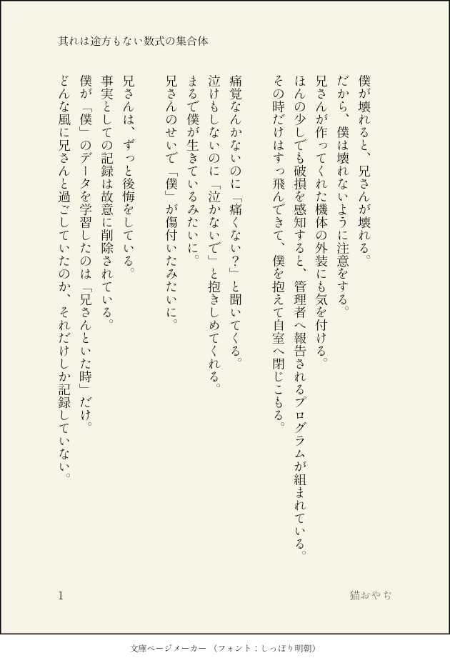 猫おやぢ☆quiet followDONE【其れは途方もない数式の集合体】ここから「イデ氏」と「オルくん」の関係性を探る旅が始まりました。 show all(+1 images) Tap to full screen (size:630x928).Repost is prohibited Let's send reactions! freqpopularsnackothersPayment processing Replies from the creator Follow creator you care about!☆quiet follow 猫おやぢDONE【技術的特異点へと至るか細い願い】単独でTwitterにあげた不穏なお話です。6章でどんなことになるやらわからない不安そのままに、それでも兄弟が好きなんだわと言う想いを込めました(?)妄想天国捏造上等、一節でもお気に召していただけると嬉しいです。 8 猫おやぢDONE2021年8月15日開催のWebオンリー【Beautiful Soup (ortho)】の無配のお話です!パスワードはWebオンリー会場の猫おやぢのお店、WORKING-STORAGE SECTION(腐スペース あ 3)のお品書きに掲載です。 26 猫おやぢDONE【とある事件】オルトくんのお話なんてことない日常の一コマです。起承転結とはなんでしょうか笑兄ちゃん、エース出てます。妄想天国捏造上等、のほほんとのんびりしております。一節でもお気に召していただけますと幸いです。 6 猫おやぢDONE【愛くるしく狂おしく】イデオルって訳ではなく、でもニュアンスはイデオルかもしれない。実にマイルドにしてありますが、兄ちゃんぶっ壊れておりますのでご留意ください。なして生魚嫌いなんかなーと考えてて、この感触や匂いと一緒にしたくないからだったら最高にクレイジーじゃね?と思い至りました。狂うほどに愛おしい。いつもの妄想天国捏造上等、兄弟に関して寛容な方のみお楽しみください。 6 猫おやぢDONE【桃色LIP小悪魔KISS】イデオル桃の節句なのでピンク色な可愛いお話をとウキウキ書きました。内容はいつも通りゆるゆるです笑妄想天国捏造上等、謎のバグが起きていますが兄好きすぎからの過剰ラーニングなのでご安心ください。ラギブチ、エペル、リドル、ヴィル出てます。楽しく読んでいただけますと幸いです! 15 猫おやぢDONE【ぼくのおとうと】もし、オルくんに「戻る場所」があるとしたら。こういうどうしようもないループに陥っているのも好きだったりします。妄想天国捏造上等、優しい気持ちでお楽しみいただけますと幸いです。 5 recommended works くじらんらMOURNING蘭菊まとめその2 5 Hatchimaru_PAST2023.1月発行マヴェハン本「Pretend that you love me」再録です。成人向け 72ページ。over18? →yes or no+アルファベット3文字 70 beetSPOILERENG TL Prompt: "I wanted to be your only one."Percival/Atlasoriginal comic © gaga👻 (@nnnooonnm) 5 Ewige13_1DOODLEファ美肉のおかげで老け顔に対して変な感情が増えた 2 h4ru_trpg_KSPOILER未完生 現行未通過×まとめ2pass:ok 12 kuge_96DONE usershockDOODLEリク 12/31更新 7 茶絵茶絵DOODLE🔞がきぬい ケーキバース/グロ/カニバ注意です 1108 utakadoDOODLE【ラズラバ】現行未通過❌そういえばやっと脳に届いたんですけどあの………!?!?!?!? 2