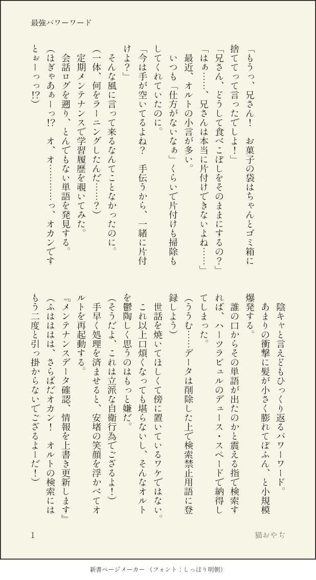 猫おやぢ☆quiet followDONE【最強パワーワード】ギャグ頑張ってみようと捻り出したモノです。 show all(+1 images) Tap to full screen (size:618x1132).Repost is prohibited Let's send reactions! freqpopularsnackothersPayment processing Replies from the creator Follow creator you care about!☆quiet follow 猫おやぢDONE【技術的特異点へと至るか細い願い】単独でTwitterにあげた不穏なお話です。6章でどんなことになるやらわからない不安そのままに、それでも兄弟が好きなんだわと言う想いを込めました(?)妄想天国捏造上等、一節でもお気に召していただけると嬉しいです。 8 猫おやぢDONE2021年8月15日開催のWebオンリー【Beautiful Soup (ortho)】の無配のお話です!パスワードはWebオンリー会場の猫おやぢのお店、WORKING-STORAGE SECTION(腐スペース あ 3)のお品書きに掲載です。 26 猫おやぢDONE【とある事件】オルトくんのお話なんてことない日常の一コマです。起承転結とはなんでしょうか笑兄ちゃん、エース出てます。妄想天国捏造上等、のほほんとのんびりしております。一節でもお気に召していただけますと幸いです。 6 猫おやぢDONE【愛くるしく狂おしく】イデオルって訳ではなく、でもニュアンスはイデオルかもしれない。実にマイルドにしてありますが、兄ちゃんぶっ壊れておりますのでご留意ください。なして生魚嫌いなんかなーと考えてて、この感触や匂いと一緒にしたくないからだったら最高にクレイジーじゃね?と思い至りました。狂うほどに愛おしい。いつもの妄想天国捏造上等、兄弟に関して寛容な方のみお楽しみください。 6 猫おやぢDONE【桃色LIP小悪魔KISS】イデオル桃の節句なのでピンク色な可愛いお話をとウキウキ書きました。内容はいつも通りゆるゆるです笑妄想天国捏造上等、謎のバグが起きていますが兄好きすぎからの過剰ラーニングなのでご安心ください。ラギブチ、エペル、リドル、ヴィル出てます。楽しく読んでいただけますと幸いです! 15 猫おやぢDONE【ぼくのおとうと】もし、オルくんに「戻る場所」があるとしたら。こういうどうしようもないループに陥っているのも好きだったりします。妄想天国捏造上等、優しい気持ちでお楽しみいただけますと幸いです。 5 recommended works emamama925TRAINING18歳以上の成人(高校生不可)とわかる方のみどうぞ。y/n 2 pwheuDOODLE之前的盧簓色图合集(内含性转,女装注意)18↑? 15 Deno_018DOODLEăn l e đậu kyokyolifeDONEリオンとらんちゅん 2 mochayu01DOODLE伝説の始まり わさびDONE麻倉家族集合写真を撮ってほしい(2024.12.30.)今年もありがとうございました。 2 海帶王中王DOODLEs/d+d/s 5 遊由(yuyu)DONEAC6の12月分幻覚まとめ。 8 甘茶絵本子DOODLE2024年9月②-11月 31