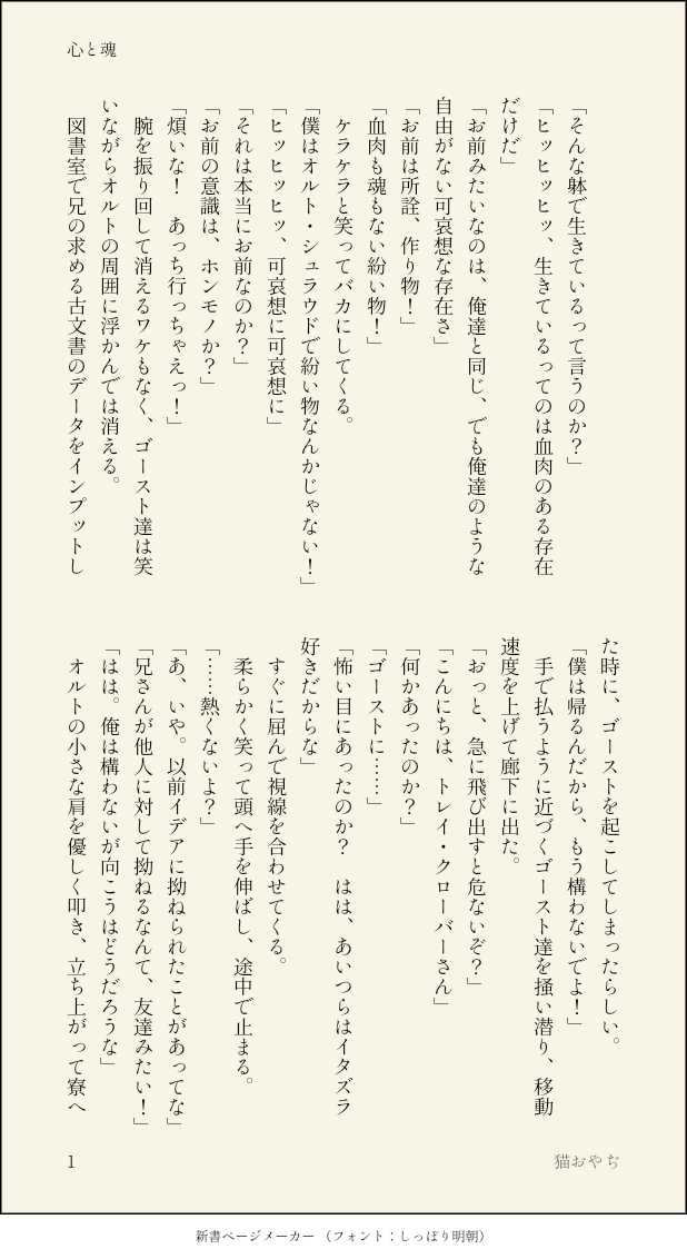 猫おやぢ☆quiet followDONE【心と魂】オルくんが「心」を理解しているだろうか、と言う着眼点から始まりました。トレイパイセンをゲストに、雰囲気だけで終わっちまった感があります。反省 show all(+3 images) Tap to full screen (size:618x1132).Repost is prohibited Let's send reactions! freqpopularsnackothersPayment processing Replies from the creator Follow creator you care about!☆quiet follow 猫おやぢDONE【技術的特異点へと至るか細い願い】単独でTwitterにあげた不穏なお話です。6章でどんなことになるやらわからない不安そのままに、それでも兄弟が好きなんだわと言う想いを込めました(?)妄想天国捏造上等、一節でもお気に召していただけると嬉しいです。 8 猫おやぢDONE2021年8月15日開催のWebオンリー【Beautiful Soup (ortho)】の無配のお話です!パスワードはWebオンリー会場の猫おやぢのお店、WORKING-STORAGE SECTION(腐スペース あ 3)のお品書きに掲載です。 26 猫おやぢDONE【とある事件】オルトくんのお話なんてことない日常の一コマです。起承転結とはなんでしょうか笑兄ちゃん、エース出てます。妄想天国捏造上等、のほほんとのんびりしております。一節でもお気に召していただけますと幸いです。 6 猫おやぢDONE【愛くるしく狂おしく】イデオルって訳ではなく、でもニュアンスはイデオルかもしれない。実にマイルドにしてありますが、兄ちゃんぶっ壊れておりますのでご留意ください。なして生魚嫌いなんかなーと考えてて、この感触や匂いと一緒にしたくないからだったら最高にクレイジーじゃね?と思い至りました。狂うほどに愛おしい。いつもの妄想天国捏造上等、兄弟に関して寛容な方のみお楽しみください。 6 猫おやぢDONE【桃色LIP小悪魔KISS】イデオル桃の節句なのでピンク色な可愛いお話をとウキウキ書きました。内容はいつも通りゆるゆるです笑妄想天国捏造上等、謎のバグが起きていますが兄好きすぎからの過剰ラーニングなのでご安心ください。ラギブチ、エペル、リドル、ヴィル出てます。楽しく読んでいただけますと幸いです! 15 猫おやぢDONE【ぼくのおとうと】もし、オルくんに「戻る場所」があるとしたら。こういうどうしようもないループに陥っているのも好きだったりします。妄想天国捏造上等、優しい気持ちでお楽しみいただけますと幸いです。 5 recommended works momotaru870DOODLE「んっ、もう、そこばっかり…。無いものをそんなに舐めなくてもいいんですよっ」「柔らかくて旨いんだ」パスワード:猫猫は羅半を何と呼ぶ?◯◯◯眼鏡(ひらがな3文字) きっか(イルタ)DOODLE無邪気に遊ぶキリンちゃんは更に可愛い(見守るリトくん) げぼくDONER-18↑? yes/noモブセバ 2 piMdoriCDONE夏コミで瀬川さんの御本に寄稿させていただいたミカちゃんフルーツ描けて楽しかった shirasaki_1122DONE💐の風i邪を接i吻でもらおうとするu.r.k.zの話 2 yukiamano77DOODLE未完遂犯行 現未×ン〜〜〜〜〜〜 KPCたち… 3 森野クマ3PROGRESS今日の進歩467体調悪すぎて数日休んじゃったけど8割回復したから今日からまた復帰。内容の部分も終わったから明日からやっと下書きと線画に入れる daidaidaijoubuDOODLEラッキーなスケベのやつ… 2 nnnnnnnai07DOODLE辜月のN( ˘ω˘ )現行未通過(げんみ)×
