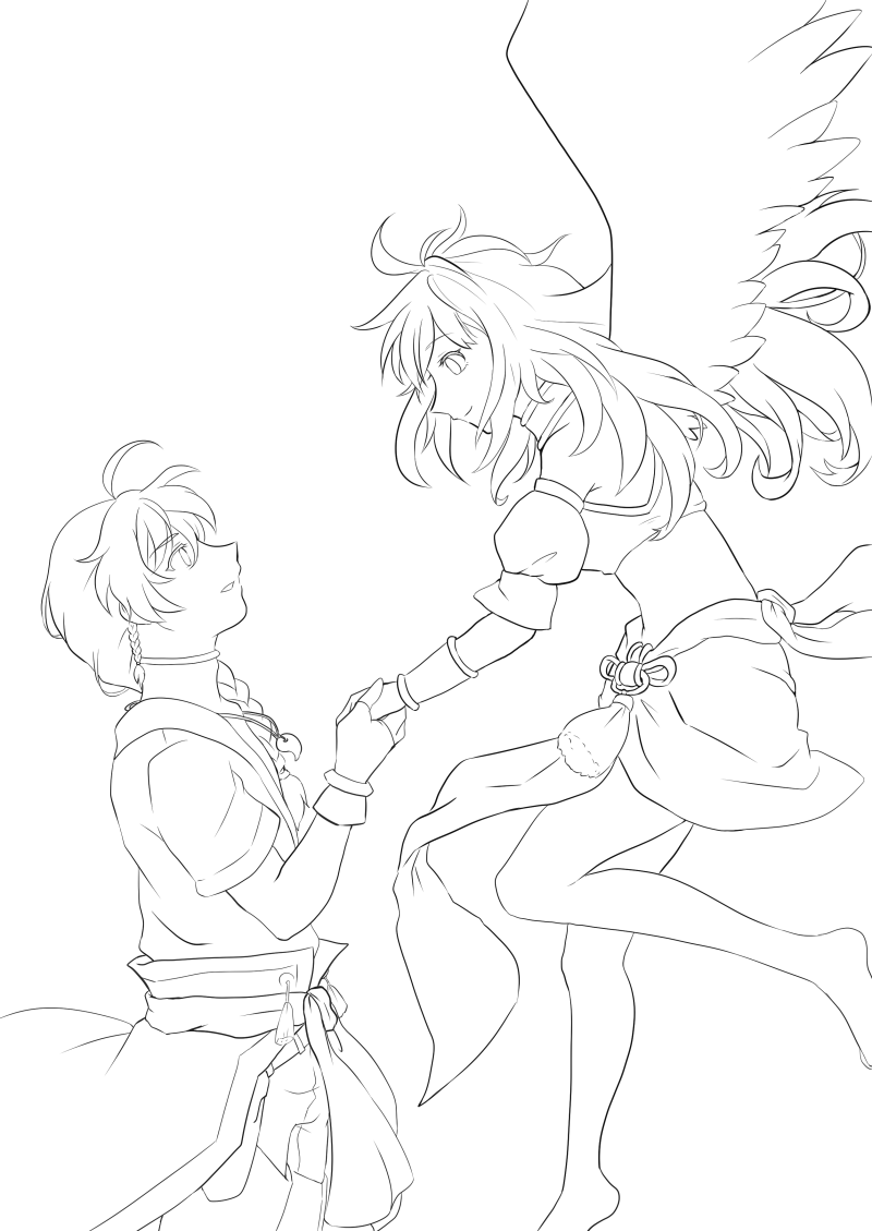 以前作ったコピ本の表紙絵の線画。実は奥の方の腕と羽は塗るときに描き足してもらっていた。ワシは自然なのが描けなかったので……